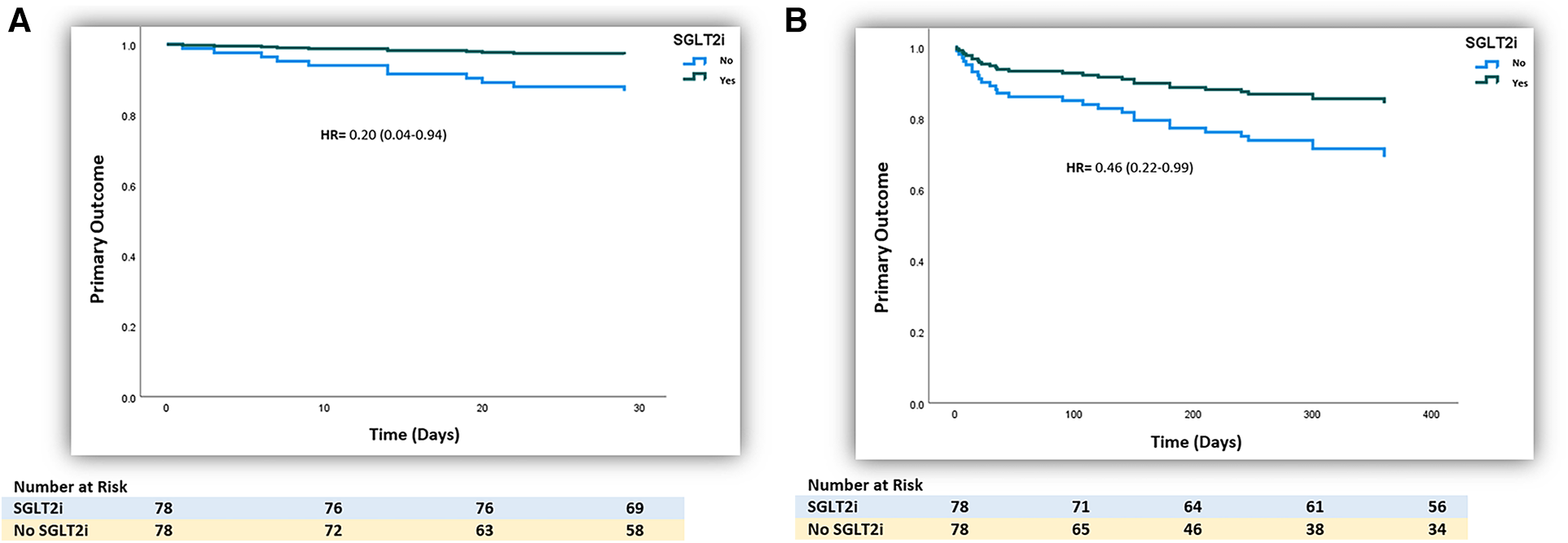 (A) Kaplan–Meier curve of the 1-month primary outcome of the use of SGLT2 inhibitors in patients with post-ischemia-induced new-onset heart failure after PS matching (n = 156). (B) Kaplan–Meier curve of the 12-month primary outcome of the use of SGLT2 inhibitors in patients with post-ischemia-induced new-onset heart failure after PS matching (n = 156).