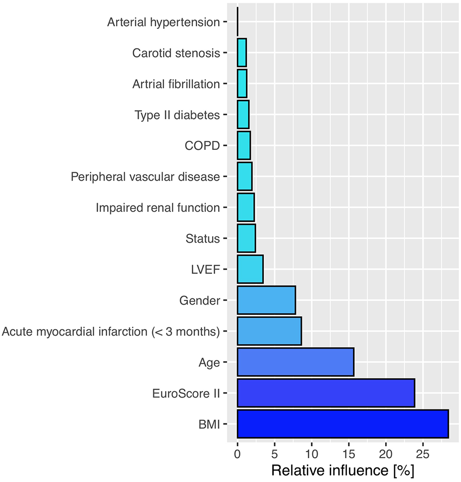 The relative influence of pre-treatment variables on the propensity score estimation. BMI, body mass index; COPD, chronic obstructive pulmonary disease; LVEF, left ventricular ejection fraction.