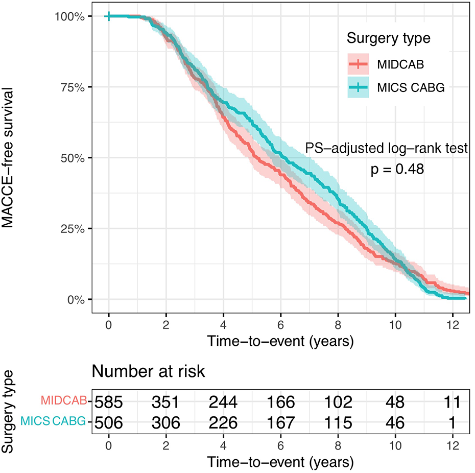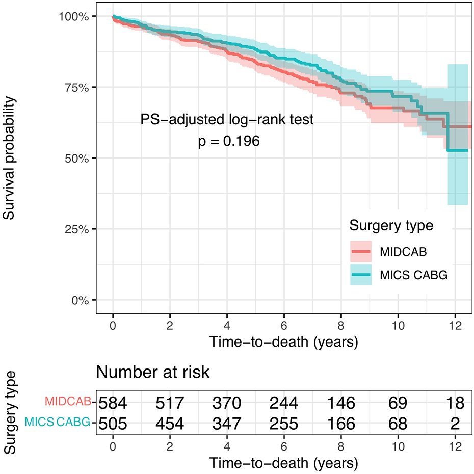This is an observational, retrospective, single center study of 1,149 patients who underwent either MIDCAB (n = 626) or MICS CABG (n = 523) at our institution between 2007 and 2018. The left internal thoracic artery and portions of the radial artery and saphenous vein were used for the patients’ single-, double-, or triple-vessel revascularization procedures. We used gradient boosted propensity-score estimation to account for possible interactions between variables. After propensity-score adjustment, the two groups were similar in terms of preoperative demographics and risk profile. Long-term follow-up (mean 5.87, median 5.6 years) was available for 1,089 patients (94.8%).