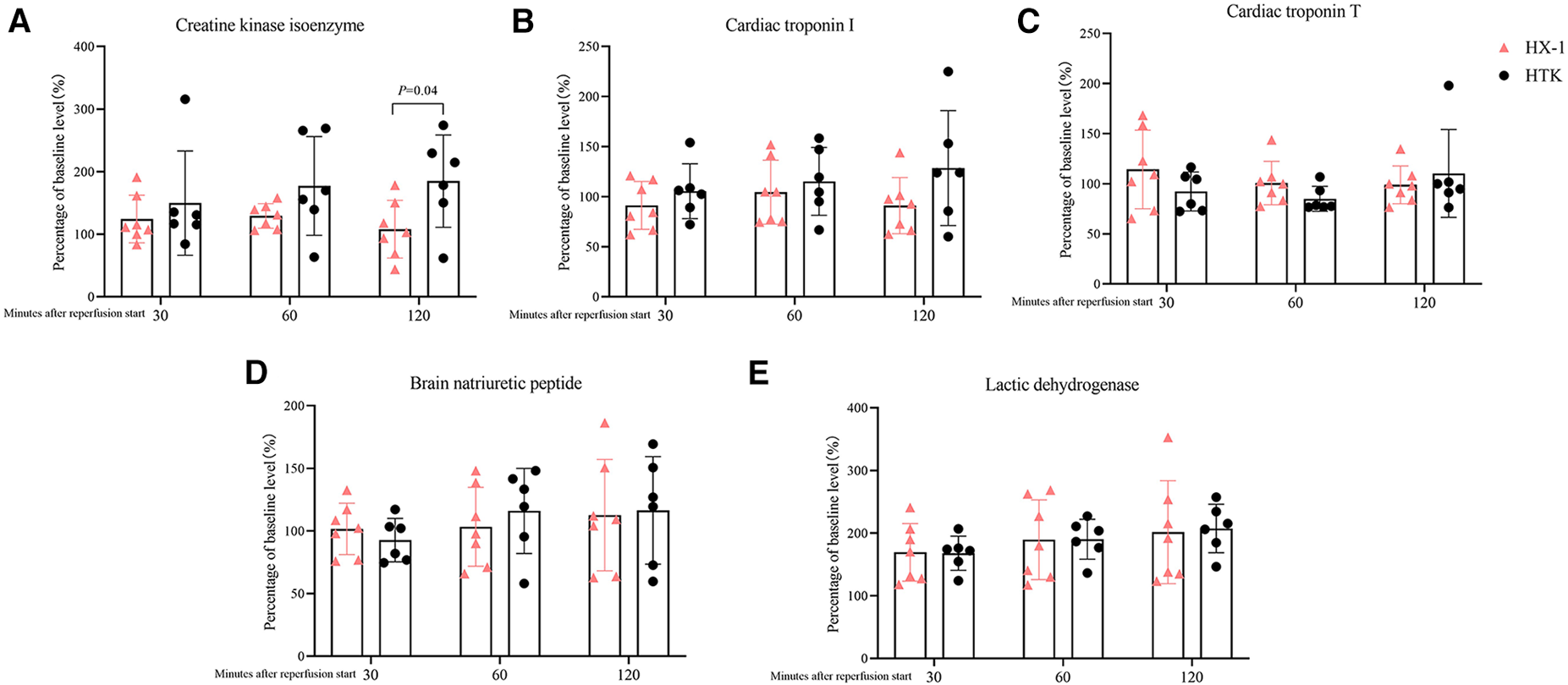 Blood samples were harvested from the central vein before surgery, after 85 min of ischemia, and after 30, 60, and 120 min after reperfusion. Samples were centrifuged at 4°C, and the plasma was assayed against creatine kinase isoenzyme, cardiac troponin I, cardiac troponin T, brain natriuretic peptide and lactic dehydrogenase using enzyme-linked immunosorbent assays from LSBio (Seattle, WA, USA). Investigators who sampled and analyzed blood were blinded to which type of cardioplegia solution each animal received.