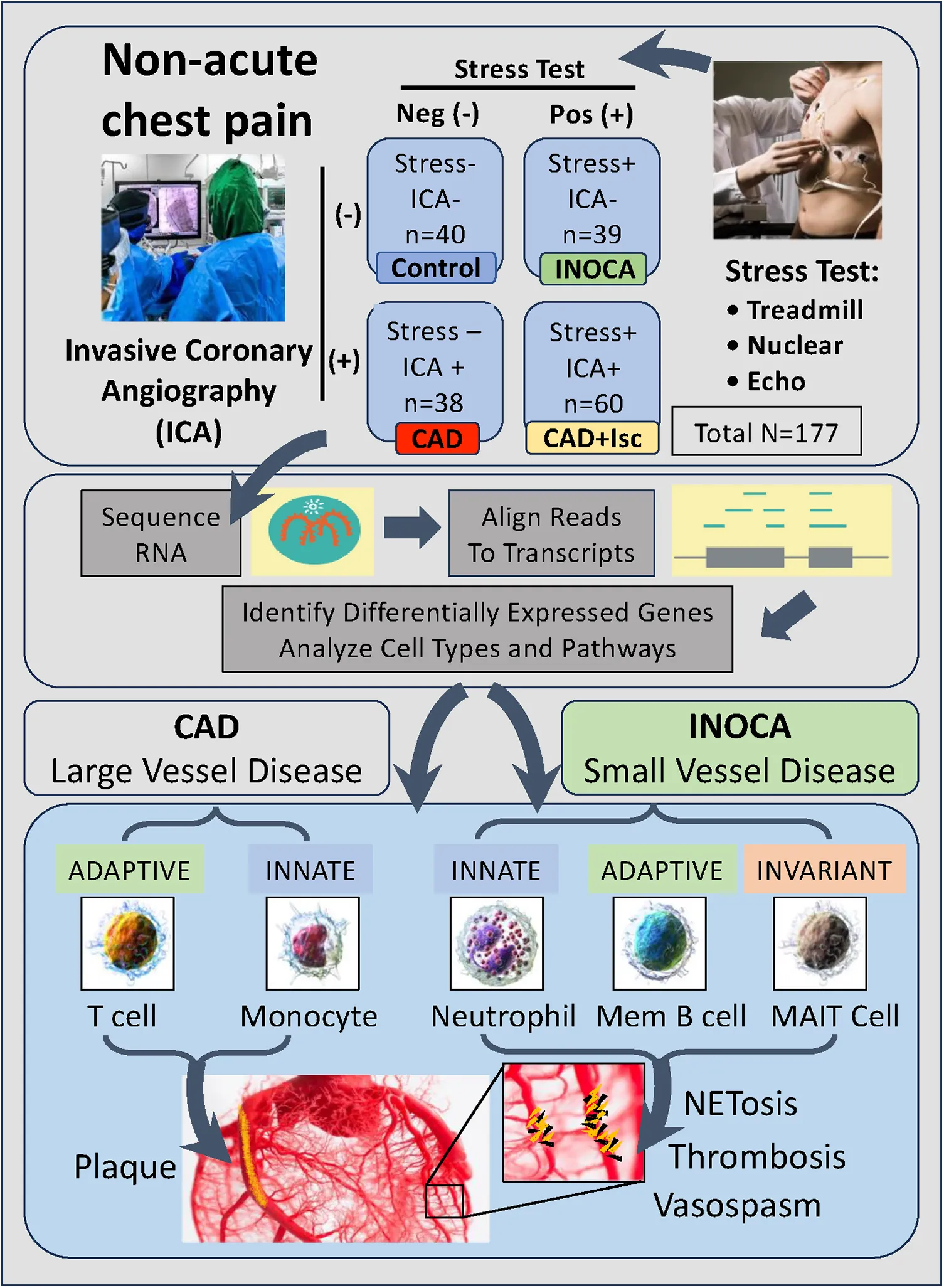 Stress testing and ICA of 177 patients identified 40 patients (23%) with INOCA compared to 39 controls (stress-, ICA-). ICA+ patients divided into 38 stress- and 60 stress+. RNAseq was performed by Illumina with ribosomal RNA depletion. Transcriptome changes were analyzed by DeSeq2 and curated by manual and automated methods.