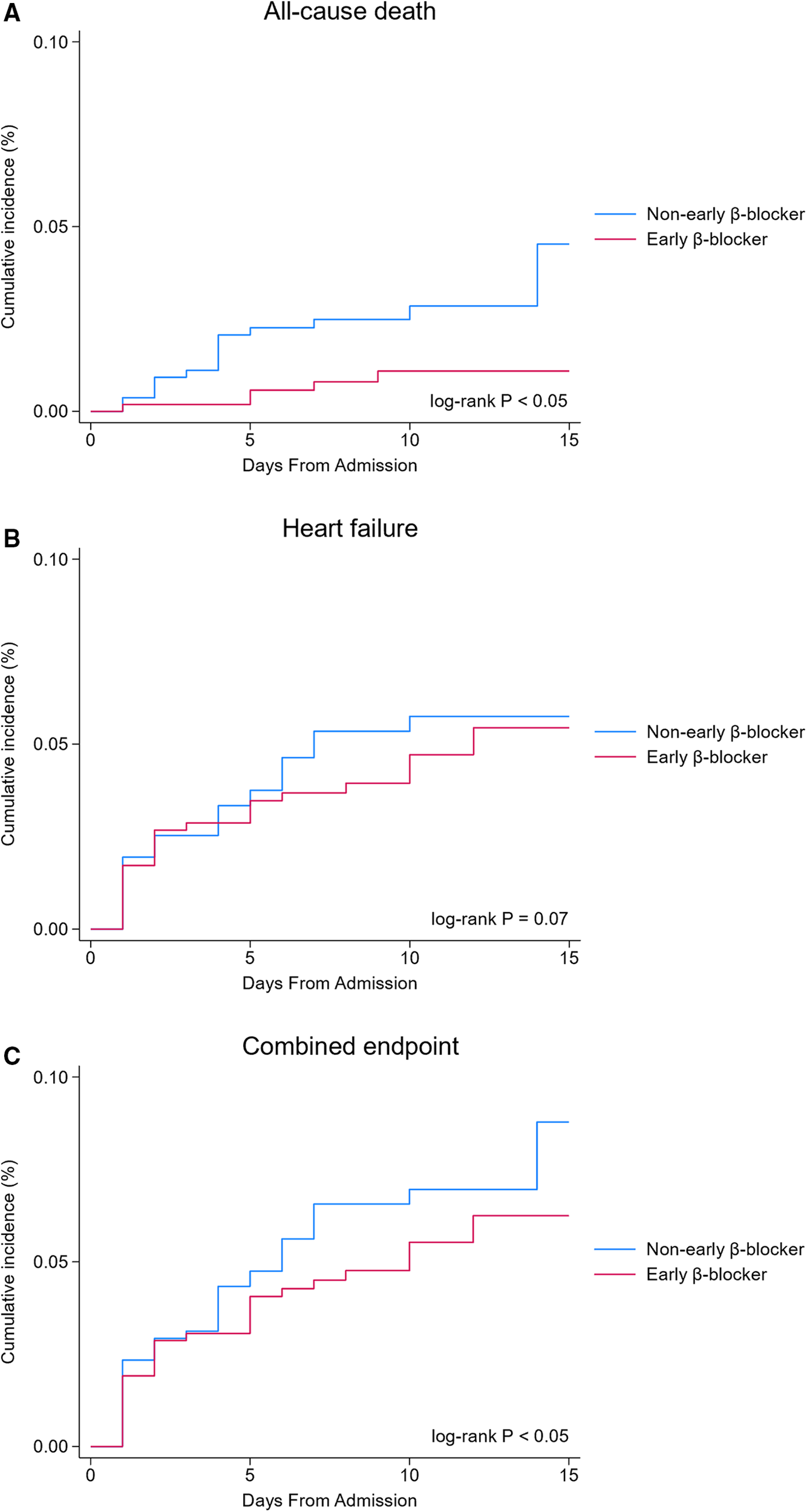 The Kaplan–Meier survival analysis showed that the incidence of the all-cause death (0.9 vs. 2.9%, P < 0.05, Figure 2A) and combined endpoint event (8.2 vs. 12.0%, P < 0.05, Figure 2C) were significantly lower in the early β-blocker treatment group compared to the non-early β-blocker treatment group.