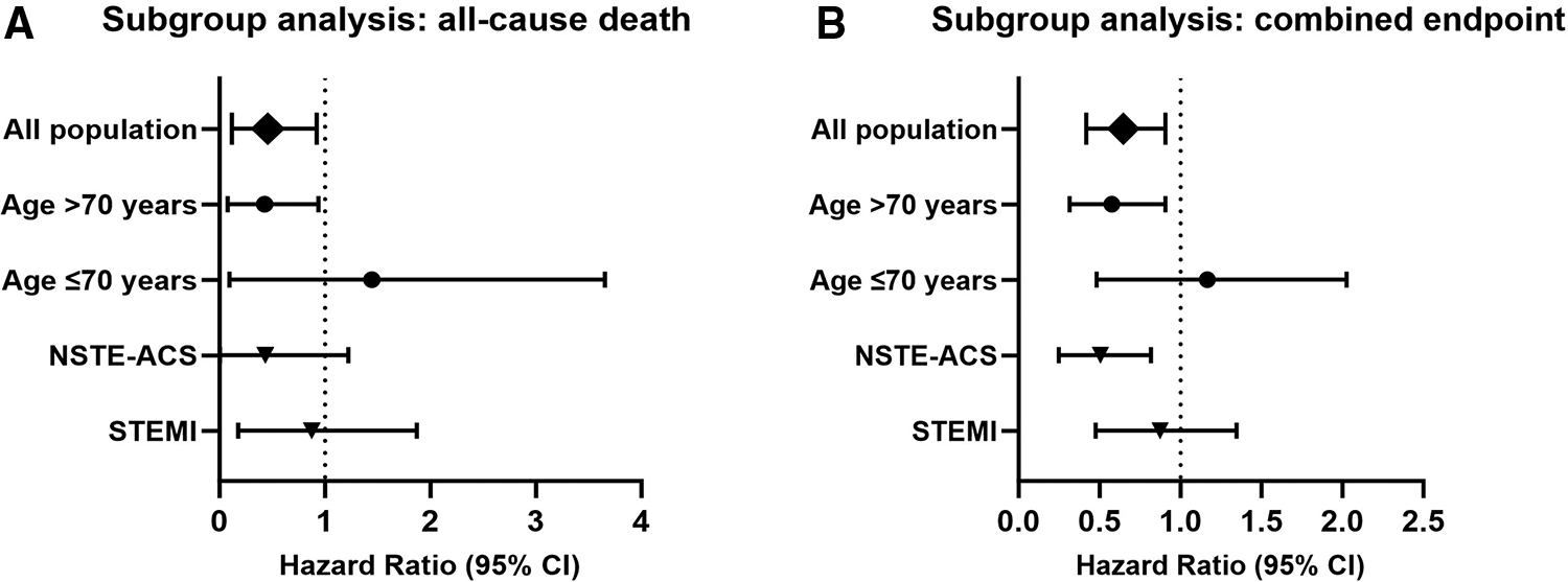 The hazard ratio for the combined endpoint events was 0.504 (95% CI 0.316–0.805) in patients older than 70 years (Figure 3B). Patients aged 70 years or younger had a hazard ratio of 0.988 (95% CI 0.482–2.026). Patients with non-ST-segment elevated ACS had a hazard ratio of 0.451 (95% CI 0.249–0.817) for combined endpoint events, indicating that patients with non-ST-segment elevated ACS may also benefit from early β-blocker use. Patients with ST-segment elevated ACS had a hazard ratio of 0.801 (95% CI 0.477–1.346).
