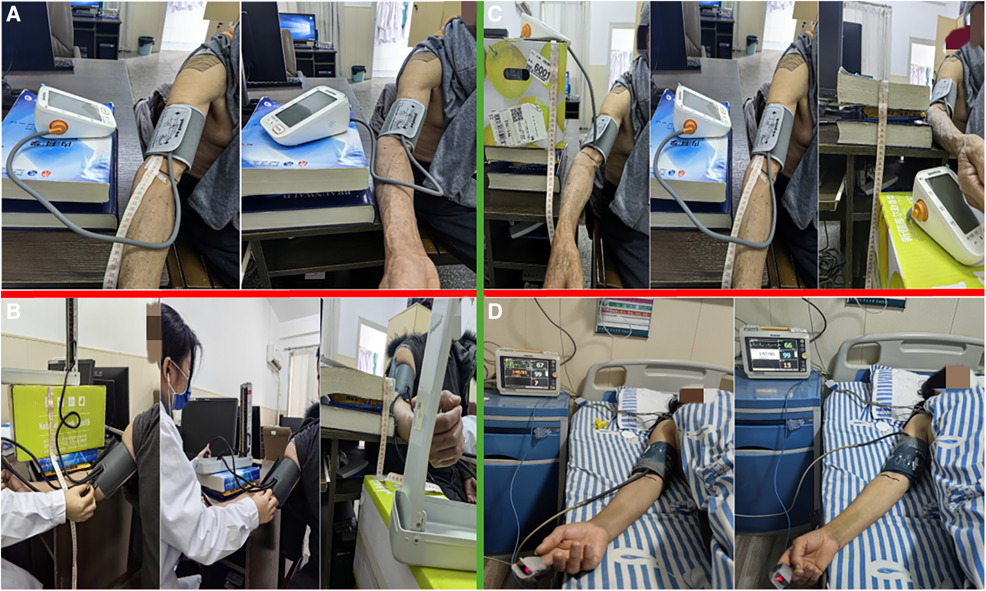 Four different sets of methods to perform blood pressure measurements. (A) Used the same upper arm sphygmomanometer to measure blood pressure and heart rate at the standard upper arm level and the elbow fossa position; (B) Positioned the zero scale level of mercury sphygmomanometers at 20 cm above, at the same level (0 cm), and 20 cm below the heart level to measure and record blood pressure readings; (C) Positioned the zero scale level of electronic sphygmomanometers at 20 cm above, at the same level (0 cm), and 20 cm below the heart level to measure and record blood pressure readings; (D) Conducted blood pressure measurements with the cuff airbag tube of the cardiac monitor facing both upward and downward.