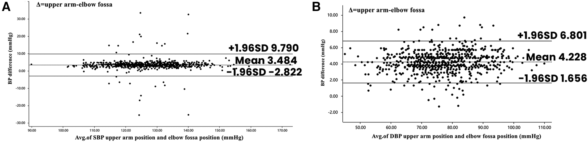 Figure 2 displays the Bland–Altman analysis of systolic and diastolic blood pressure measurements taken with an electronic blood pressure monitor in the standard upper arm and elbow fossa positions (n = 763).