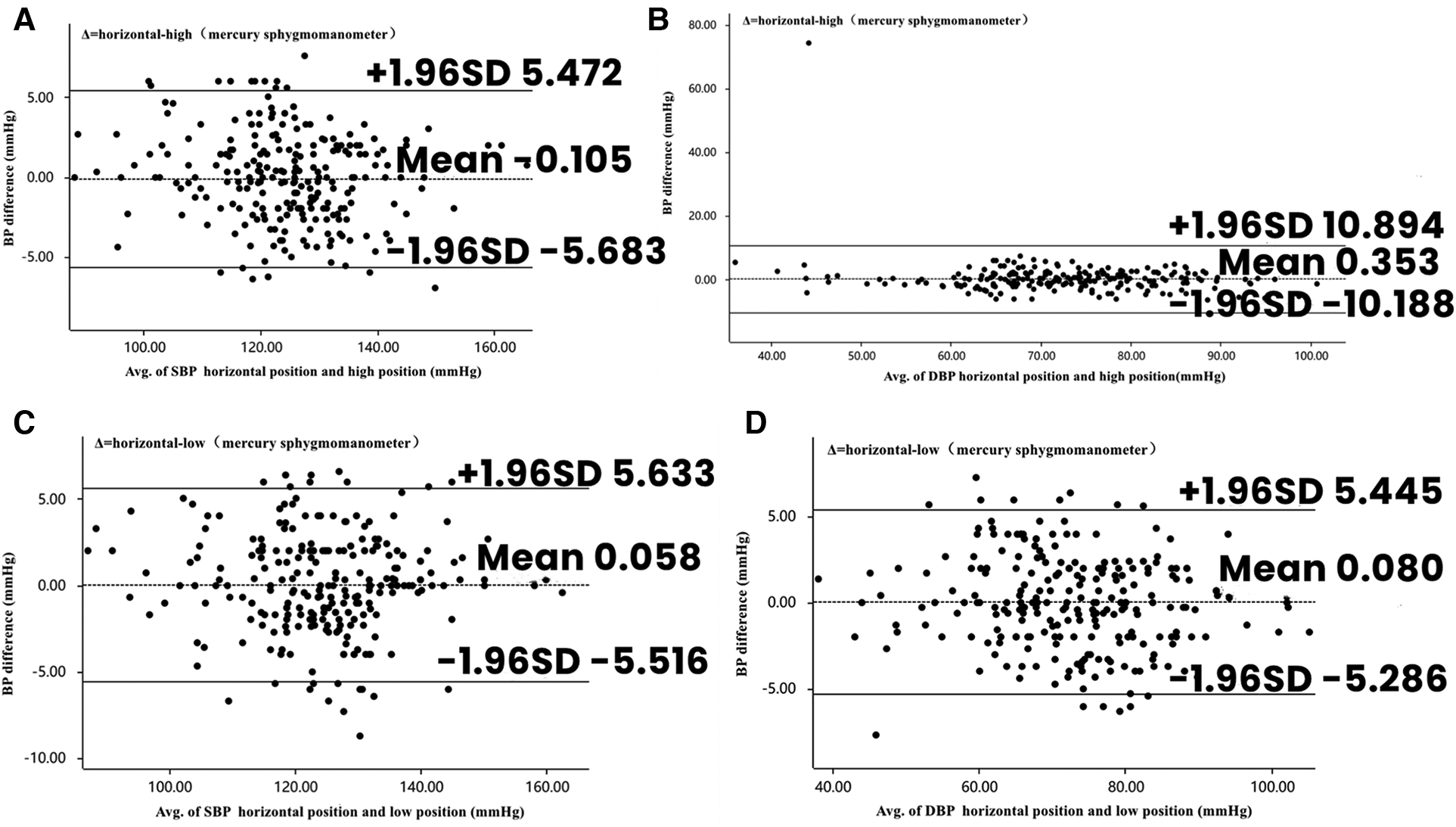 Bland–Altman plots depicting the degree of BP differences across the range of BP in placement of mercury sphygmomanometers in different positions. (A) The difference in SBP between horizontal and high positions in mercury sphygmomanometers. (B) The difference in DBP between horizontal and high positions in mercury sphygmomanometers. (C) The difference in SBP between horizontal and low positions in mercury sphygmomanometers. (D) The difference in DBP between horizontal and low positions in mercury sphygmomanometers. BP, blood pressure; DBP, diastolic blood pressure; SBP, systolic blood pressure.