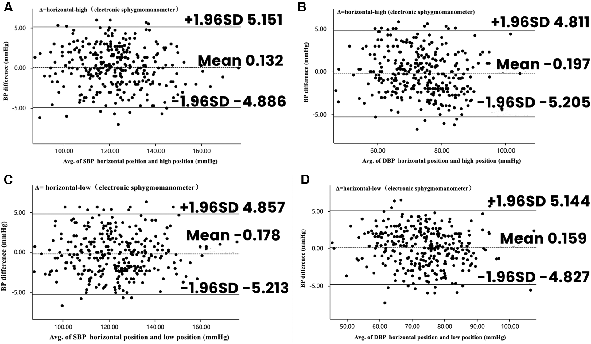 Bland–Altman plots depicting the degree of BP differences across the range of BP in placement of electronic sphygmomanometers in different positions. (A) The difference in SBP between horizontal and high positions in electronic sphygmomanometers. (B) The difference in DBP between horizontal and high positions in electronic sphygmomanometers. (C) The difference in SBP between horizontal and low positions in electronic sphygmomanometers. (D) The difference in DBP between horizontal and low positions in electronic sphygmomanometers. BP, blood pressure; DBP, diastolic blood pressure; SBP, systolic blood pressure.