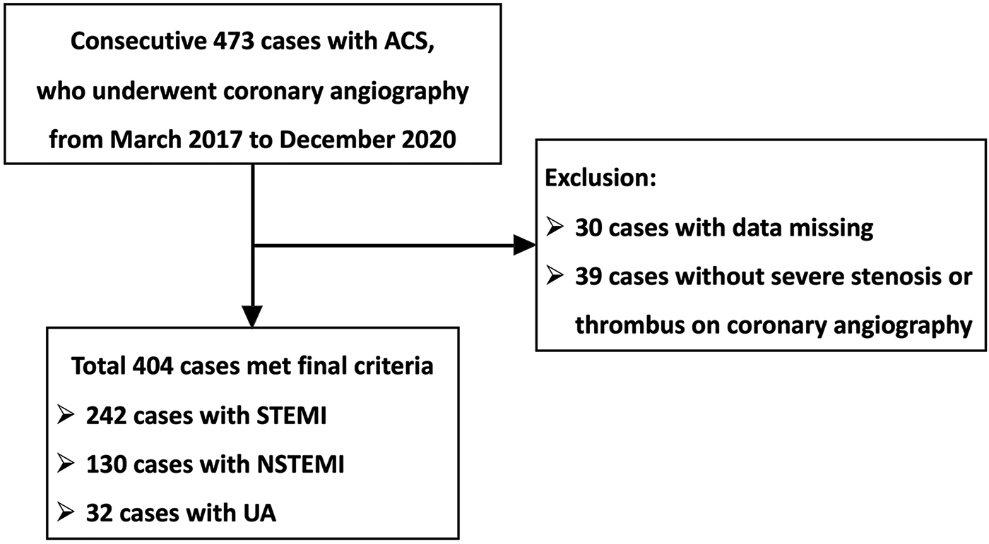 Flow diagram for the study population. ACS, acute coronary syndrome; STEMI, ST-segment elevation myocardial infarction; NSTEMI, non-ST-segment elevation myocardial infarction; UA, unstable angina.
