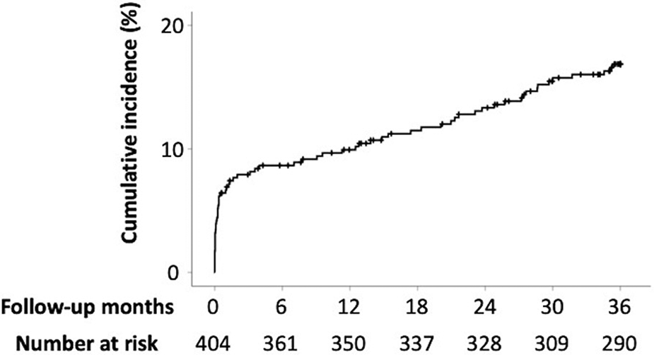 In total, 66 patients died during the 36-month follow-up period. The median follow-up period for the overall study was 1,080 days (interquartile range: 1,022–1,080). The cumulative incidence rates of all-cause mortality at 1, 6, 12, 24, and 36 months were 6.7%, 8.7%, 9.9%, 13.3%, and 16.9%, respectively (Figure 2).