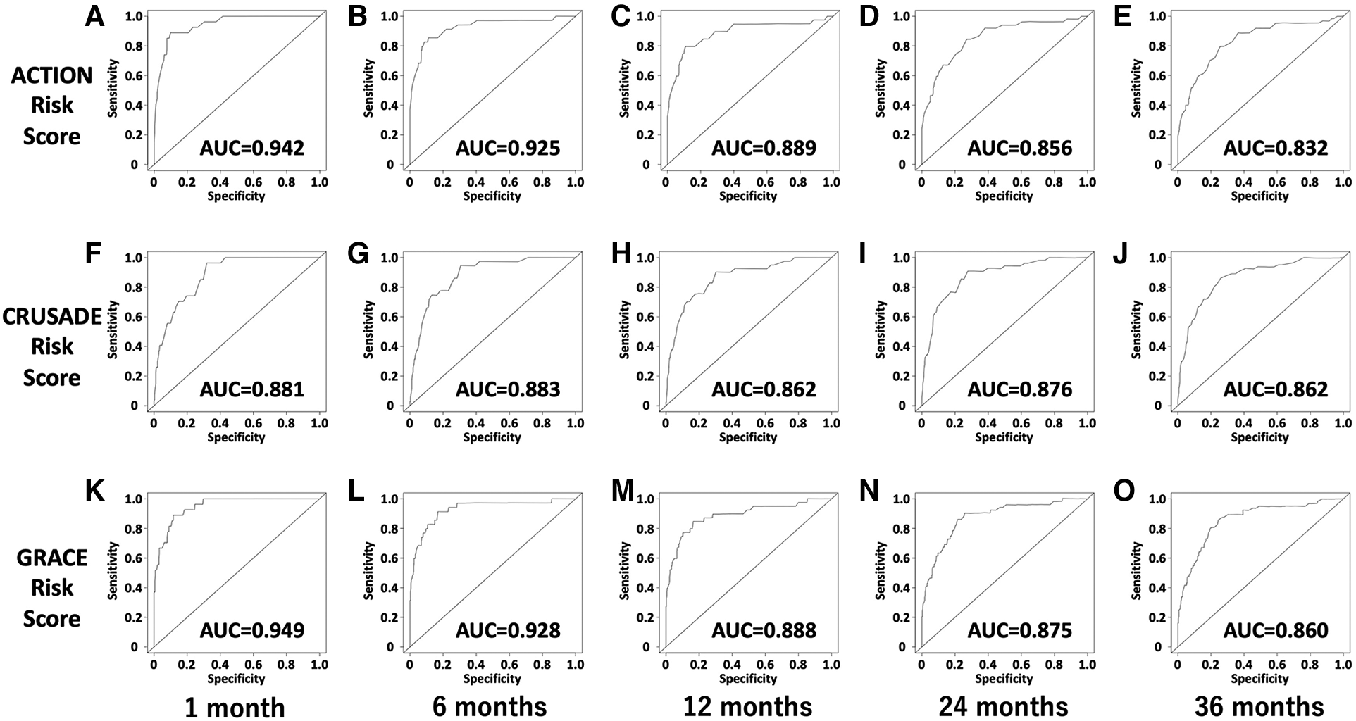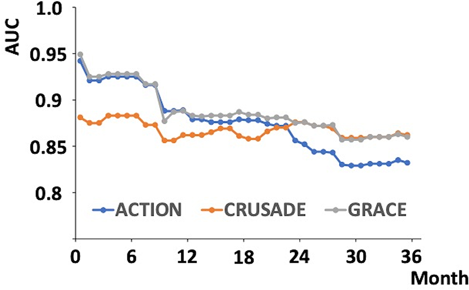 Sixty-six patients died during the observation periods. The AUCs at 1, 6, 12, 24, and 36 months of the ACTION score were 0.942, 0.925, 0.889, 0.856, and 0.832; those of the CRUSADE score were 0.881, 0.883, 0.862, 0.876, and 0.862; and those of the GRACE score 0.949, 0.928, 0.888, 0.875, and 0.860, respectively.