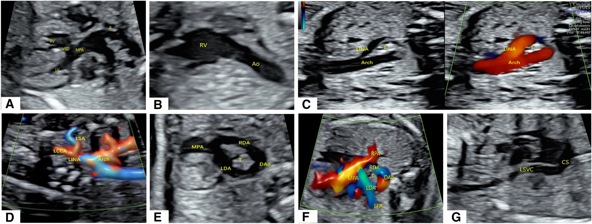 Abnormal cardiac structure and vascular abnormalities in the fetus. (A,B) 2D grayscale images showing d-TGA combined with a VSD. (C,D) 2D grayscale combined with CDFI showing RAA-MIB. (E,F) 2D grayscale combined with CDFI showing BDA encircling the trachea. (G) 2D grayscale showing that the PLSVC converges into the CS.