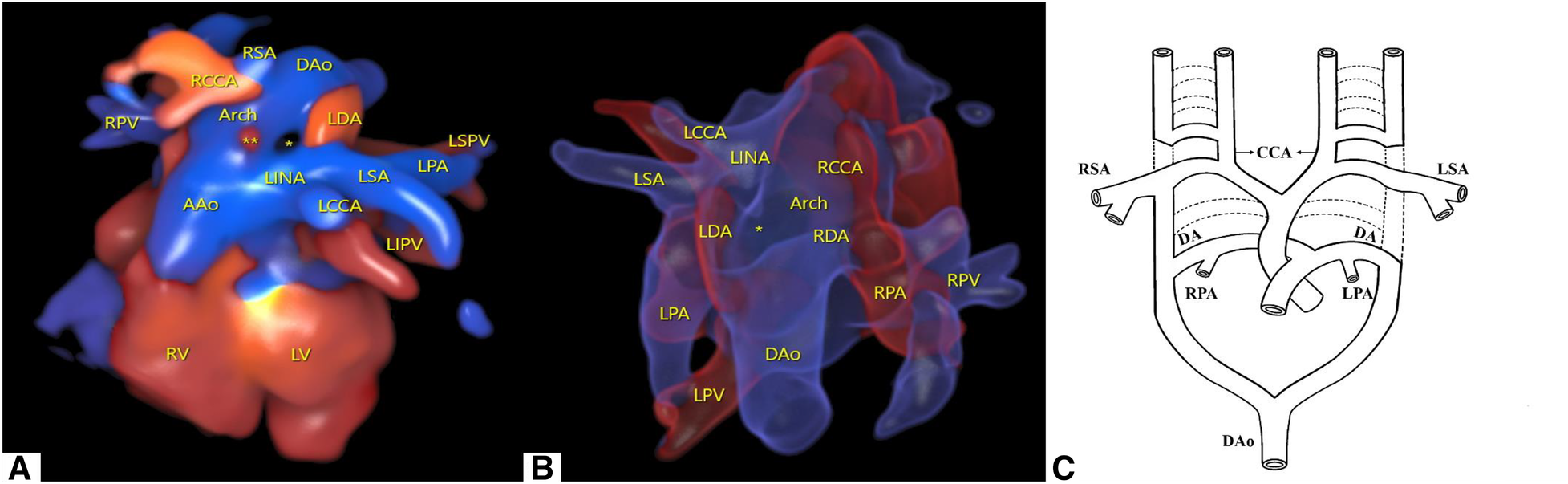 BDA, bilateral ductus arteriosus; d-TGA, dextro-transposition of the great arteries; 2D, two-dimensional; RAA, right aortic arch; VSD, ventricular septal defect; PLSVC, persistent left superior vena cava; 4D, four-dimensional; STIC, spatiotemporal image correlation; LV, left ventricle; RV, right ventricle; MPA, main pulmonary artery; Ao, aorta; Arch, aortic arch; LINA, left innominate artery; LCCA, left common carotid artery; RCCA, right common carotid artery; LSA, left subclavian artery; RSA, right subclavian artery; LDA, left ductus arteriosus; RDA, right ductus arteriosus; DAo, descending aorta; IPV, inferior pulmonary vein; SPV, superior pulmonary vein; T, trachea; IVC, inferior vena cava; SVC, superior vena cava; CS, coronary sinus; RAA-MIB, right aortic arch mirror-image branching; DAA, double aortic arch; LAA, left aortic arch; RAA, right aortic arch; PA, pulmonary atresia; ILSA, isolated left subclavian artery; ALSA, aberrant left subclavian artery; IRSA, isolated right subclavian artery; ARSA, aberrant right subclavian artery; CHD, congenital heart disease; IAA, interruption of aortic arch; AVSD, atrioventricular septal defect; PTA, persistent truncus arteriosus; SV, single ventricle.