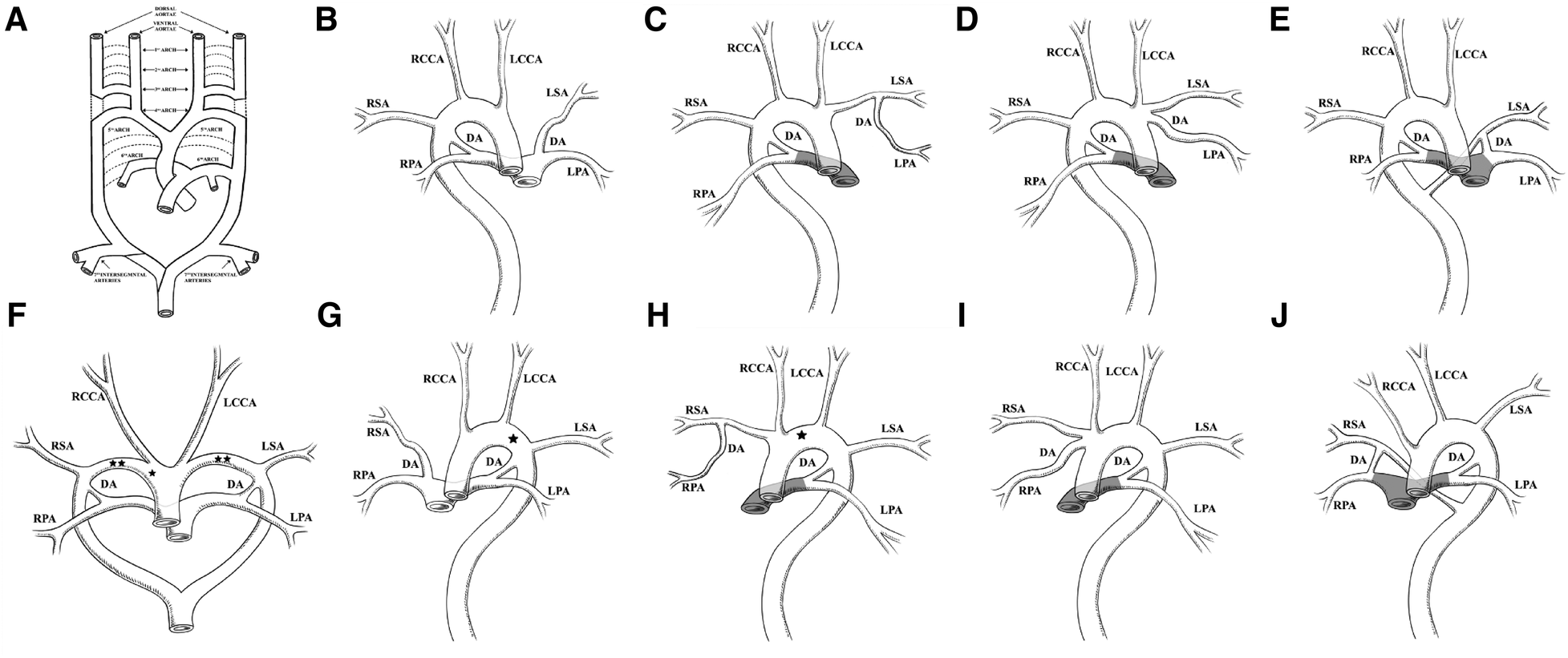 Edward's DAA system theory and the nine combinations of BDA and aortic arch abnormalities summarized in the literature. (A) Edward's DAA system theory. The dotted line represents regression, and the black solid line represents the preserved primitive arch artery. Reprinted with permission of Radiological Society of North America, from Hanneman et al. (1). (B) RAA combined with an ILSA. The LSA originates from the LPA via the LDA. (C) RAA-MIB combined with PA. The LPA originates from the LSA via the LDA. (D) RAA-MIB with or without PA. The LPA originates from the LINA via the LDA. (E) RAA combined with an aberrant left subclavian artery (ALSA). The LDA is connected to the LPA and ALSA. (B–E) RDA is connected to the RPA and the DAo. (F) DAA combined with BDA. The LDA is connected to the LPA and left arch, and the RDA is connected to the RPA and right arch. *represents interruption of the aortic arch (IAA) occurring in the right arch; **represents IAA occurring on both sides of the aortic arch. (G) LAA combined with IRSA. The RSA originates from the RPA via the RDA. *represents IAA occurring in the left arch. (H) LAA, RPA originates from the RSA via the RDA, with or without PA. *represents IAA occurring in the left arch. (I) LAA, RPA originates from the INA via the RDA, with or without PA. (J) LAA combined with ARSA, with or without PA. The RDA is connected to RPA and ARSA, respectively. (G–J) LDA is connected to the LPA and the DAo. The shadowed area in panels (C–E) and (H–J) represents PA.