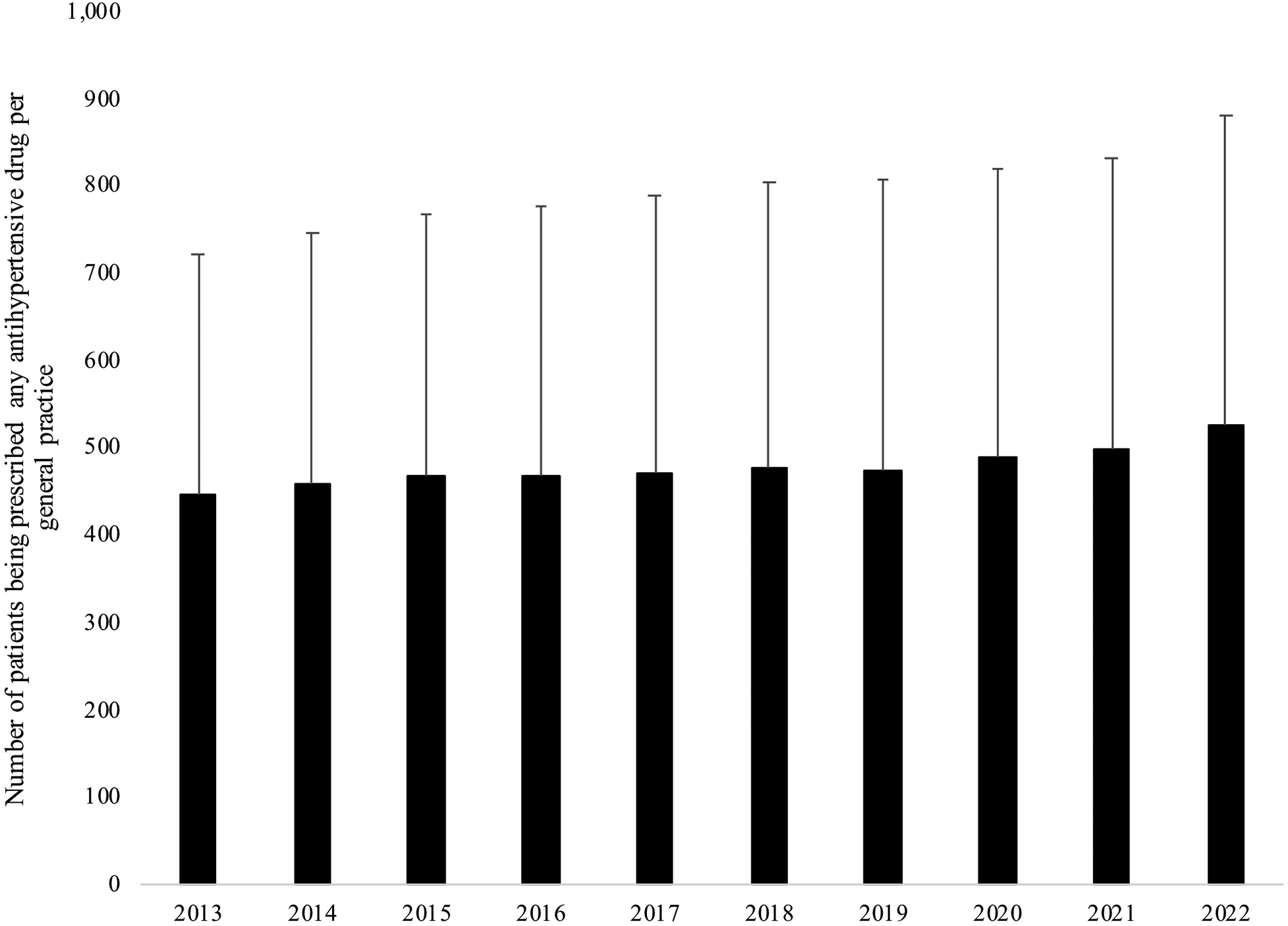 The present study aimed to investigate trends in the number of adults diagnosed with hypertension and those being prescribed antihypertensive drugs each year in general practices from this country between 2013 and 2022.
