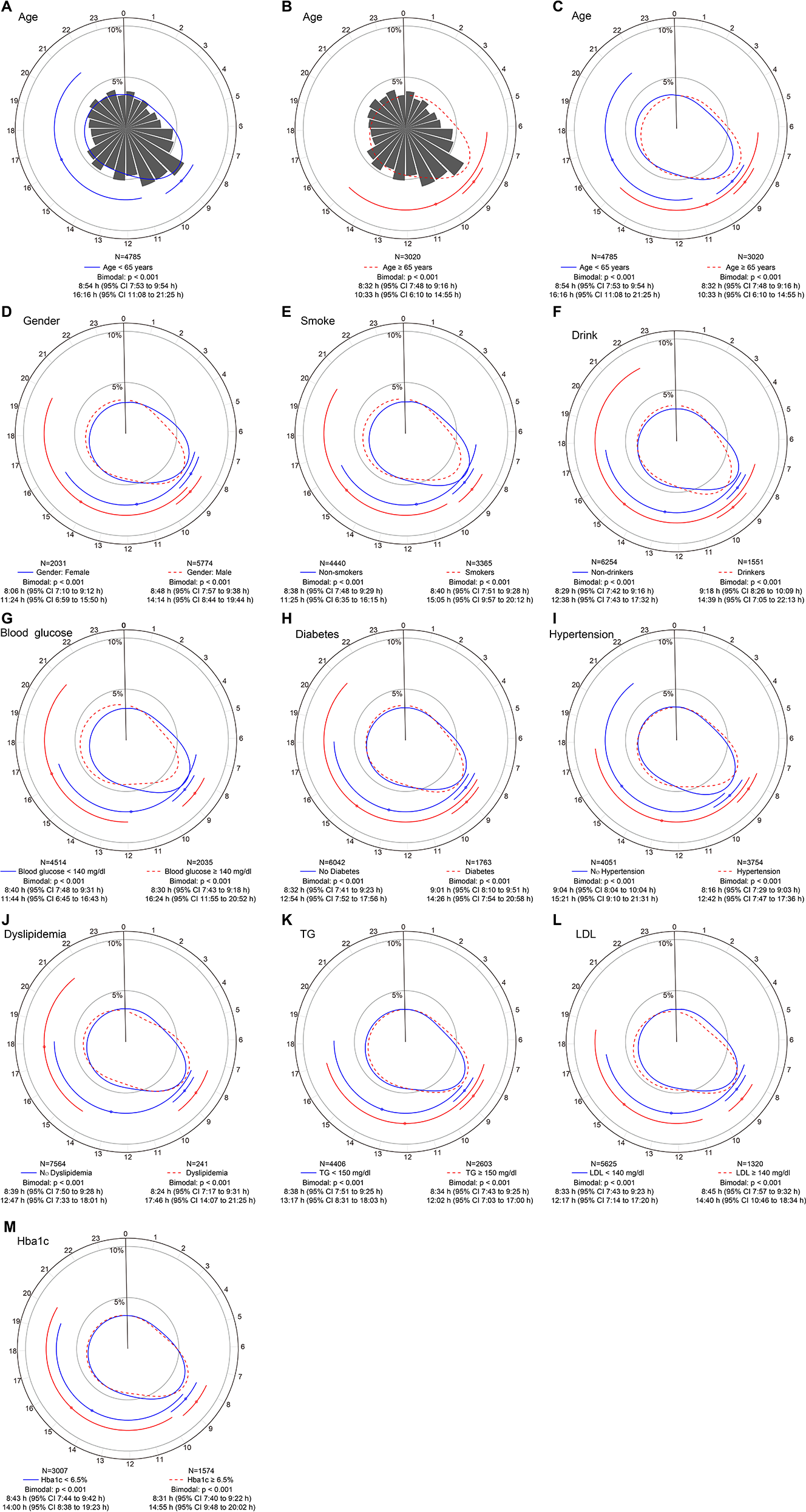 Circadian rhythm pattern of STEMI onset based on baseline factors. Panel (A–C) shows circular plots fitting the von Mise distribution in subgroups aged ≥65 years and <65 years. Panel (D–M) show circular plots fitting the von Mise distribution in subgroups stratified by sex, smoking habits, drinking habits, blood glucose levels, diabetes, hypertension, dyslipidemia, triglyceride (TG) levels, low-density lipoprotein (LDL) levels and glycated hemoglobin (HbA1c) levels. The estimated peak onset times and 95% CIs are shown below each circular plot. p values are used to determine whether the circadian rhythm pattern of STEMI onset was uniform, unimodal or bimodal. CI, confidence interval; STEMI, ST-segment elevation myocardial infarction.