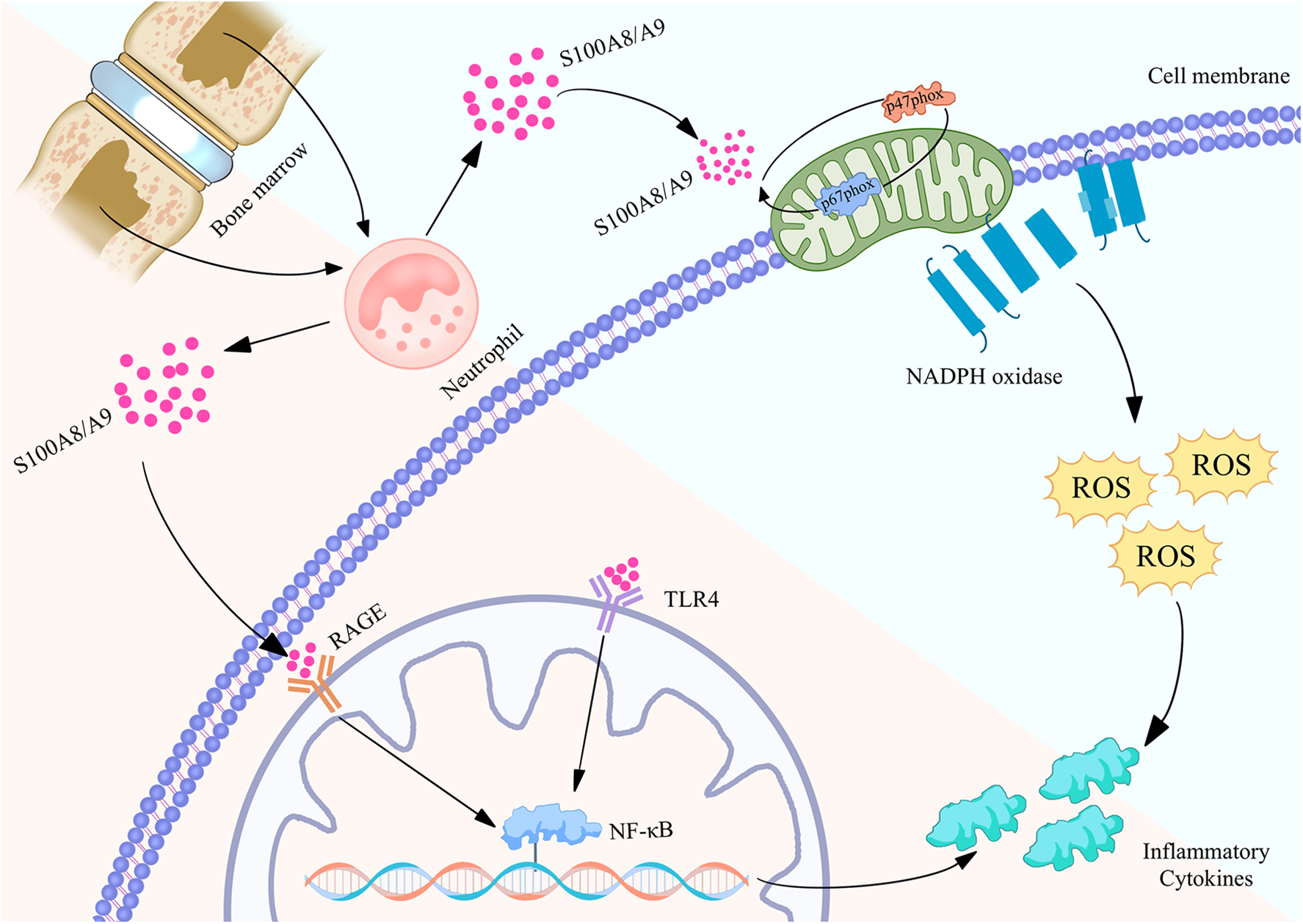 Biological function of S100A8/A9 proteins in neutrophils and their mechanism of regulating inflammatory action map. S100A8/A9 is released by neutrophils in the bone marrow and binds to RAGE and TLR4 receptors on the cell membrane, activating the NF - κB signaling pathway, thereby causing the expression of inflammatory factors. Meanwhile, S100A8/A9 can also activate NADPH oxidase, produce reactive oxygen species (ROS), and further promote inflammatory response. These pathways collectively promote the occurrence and development of inflammation, revealing the important role of S100A8/A9 in cardiovascular disease.