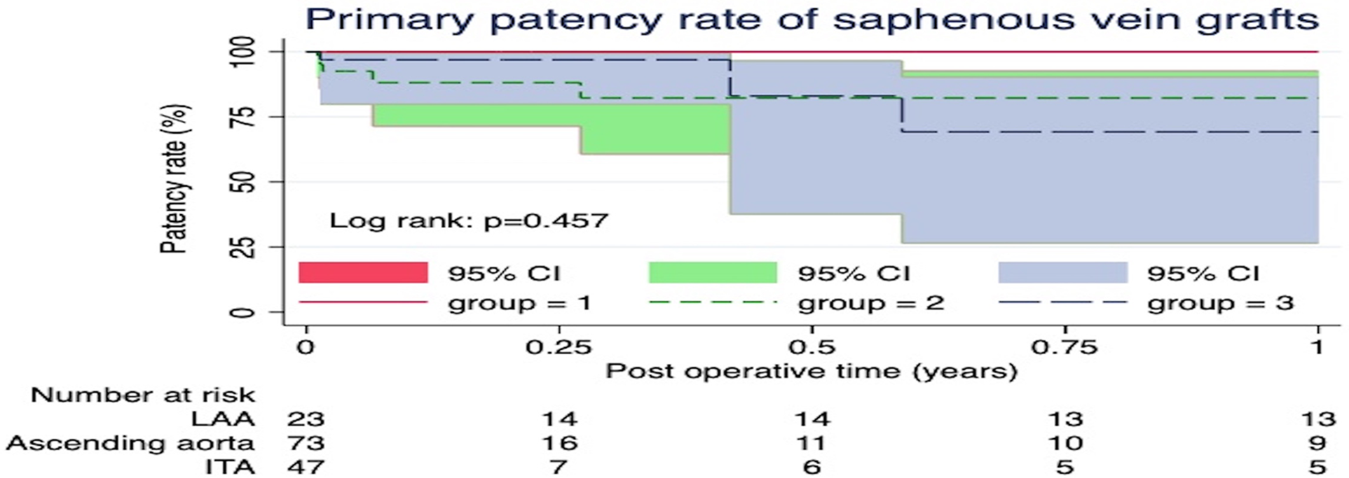 There were 84 males, with mean age of 65.9 ± 7.0 years. There were no significant differences in preoperative characteristics between groups. Mean operation times were 254.6 ± 72.2, 213.7 ± 57.6, and 253.0 ± 81.2 min, and the average numbers of distal anastomoses were 2.9 ± 0.9, 2.4 ± 0.7 and 2.9 ± 1.1 in the Aorta, ITA and LAA groups respectively. Days in intensive care, hospital stay, and major complications did not differ between the groups. Early patency of SVG did not significantly differ among groups: 93.0% in the Aorta group, 98.0% in the ITA group, and 100% in the LAA group. Mean follow-up period was 136.7 ± 295.7 days, and follow-up coronary CTA revealed 18 SVG occlusions (Aorta group n = 8, ITA group n = 5, LAA group n = 5). The Kaplan-Meier curve for SVG patency rates did not show any significant differences among the three groups.
