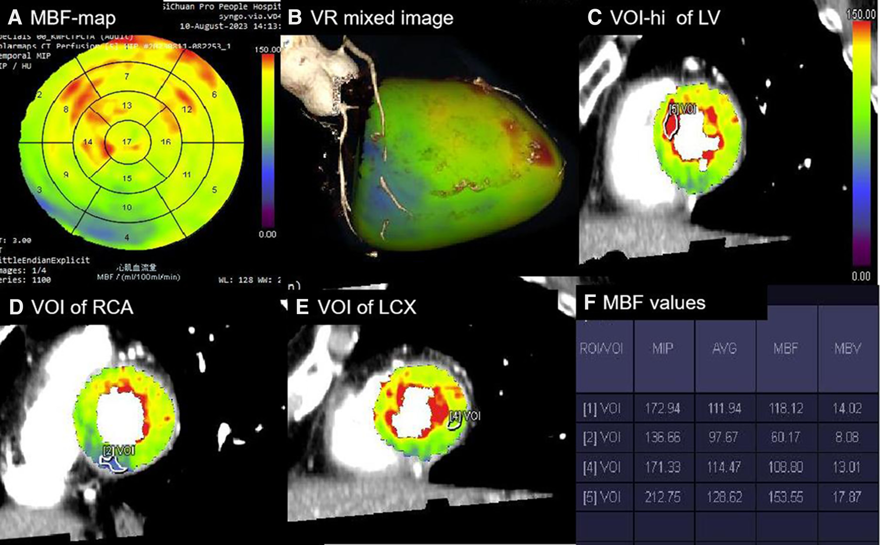 Processing of absolute and relative MBF values. (A) Polar map of MBF showing the MBF values in 1–17 segments with a color-coded scale. (B) Mixed-volume rendering image of CCTA combined with MBF showing the cardiac segments of three coronary artery territories. (C) VOI [5] with a minimum size of 0.5 cm2 manually delineated in the highest perfusion regions of the LV in the short-axis images. (D) VOI [2] delineated in the lowest region of the RCA territory. (E) VOI [4] delineated in the lowest region of the LCX territory. (F) Perfusion parameters automatically calculated for all VOIs [1], referring to the average perfusion of the LV. The MBF-ratio values could then be determined using the following equation: MBF-ratio = lowest MBF value/reference MBF value. RCA, right coronary artery; LCX, left circumflex artery.