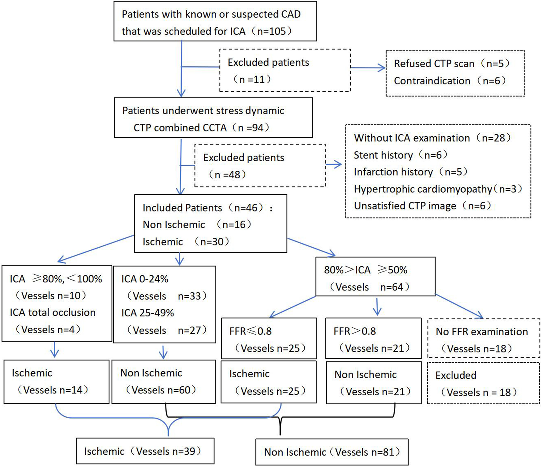 Among the 105 patients with suspected or known hemodynamically significant CAD, 94 underwent CT-MPI combined with CCTA examinations. We excluded 48 patients due to coronary artery stenting (n = 6), a history of myocardial infarction (n = 5), hypertrophic cardiomyopathy (n = 3), not undergoing ICA (n = 28), and image quality not meeting postprocessing requirements (n = 6). Finally, the remaining 46 patients were evaluated; of these, 30 and 16 patients were diagnosed with the presence and absence of myocardial ischemia, respectively. Twenty-nine patients had moderate stenosis (50%–69%), while 17 patients had severe or occluded stenosis (≥70%) on CCTA. Of the 132 vessels initially evaluated, 12 vessels with 50%–80% stenosis not tested by FFR were excluded. Therefore, 120 vessels were analyzed, including 39 and 81 vessels with the presence and absence of myocardial ischemia, respectively. In total, 33, 27, 46, and 10 vessels had 0%–24%, 25%–49%, 50%–80%, and 80%–99% stenosis, respectively, and 4 vessels had chronic total occlusion on ICA. The flowchart is presented in Figure 2.