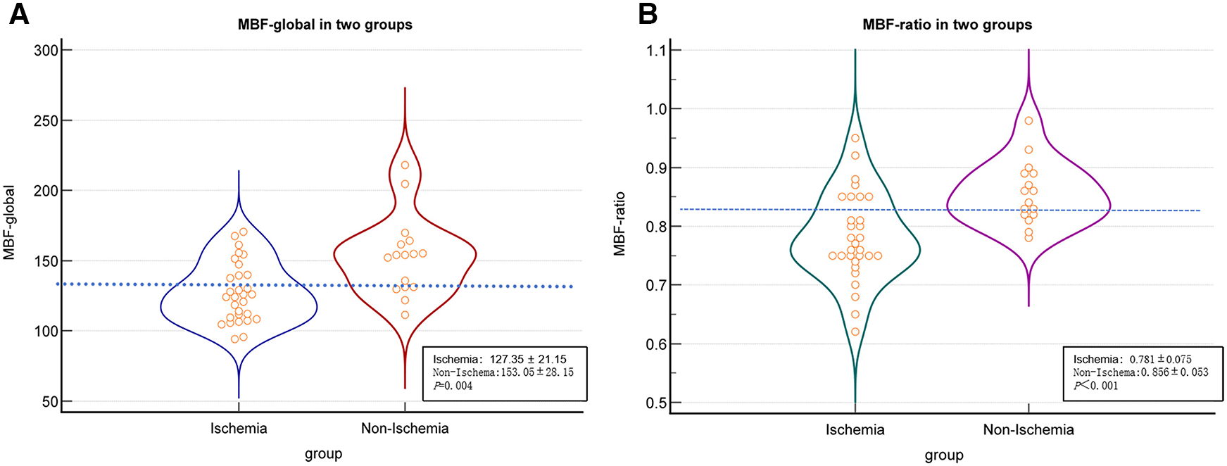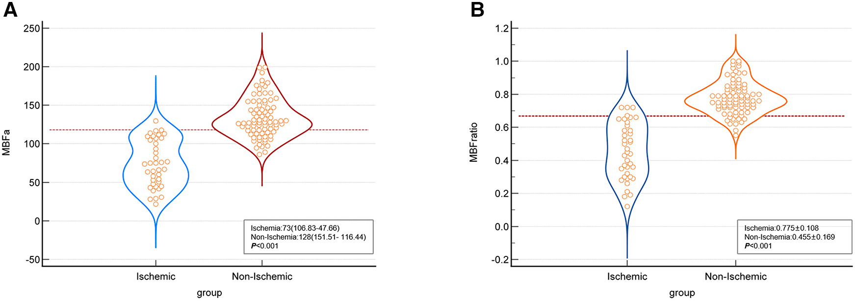 Comparison graphs of MBFa and the MBF-ratio in the ischemic and non-ischemic groups in the per-vessel analysis. (A) Graph showing the distribution of the mean ± SD MBFa in the ischemic (blue) and non-ischemic (red) groups. The dotted line shows the optimal cutoff value (117.71 ml/100 ml/min). (B) Graph showing the distribution of the mean ± SD MBF-ratio in the ischemic (blue) and non-ischemic groups (orange). The dotted line shows the optimal cutoff value (0.67).