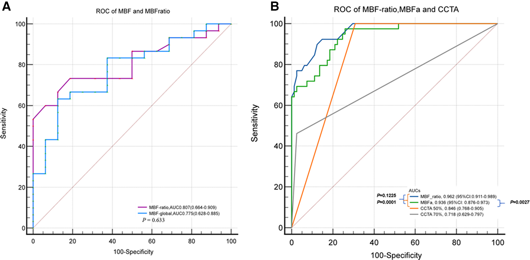 ROC curves of MBFa and the MBF-ratio for detecting MI. (A) ROC curves showing the AUCs of MBFa (0.705) and the MBF-ratio (0.807) for detecting MI (0.705 vs. 0.807, P = 0.633) in the per-patient analysis. (B) ROC curves showing that the AUCs of MBFa and the MBF-ratio are higher than that of CCTA for detecting MI with ≥50% and ≥70% stenosis (0.936 and 0.962 vs. 0.846 and 0.718, P < 0.05, respectively) in the per-vessel analysis.