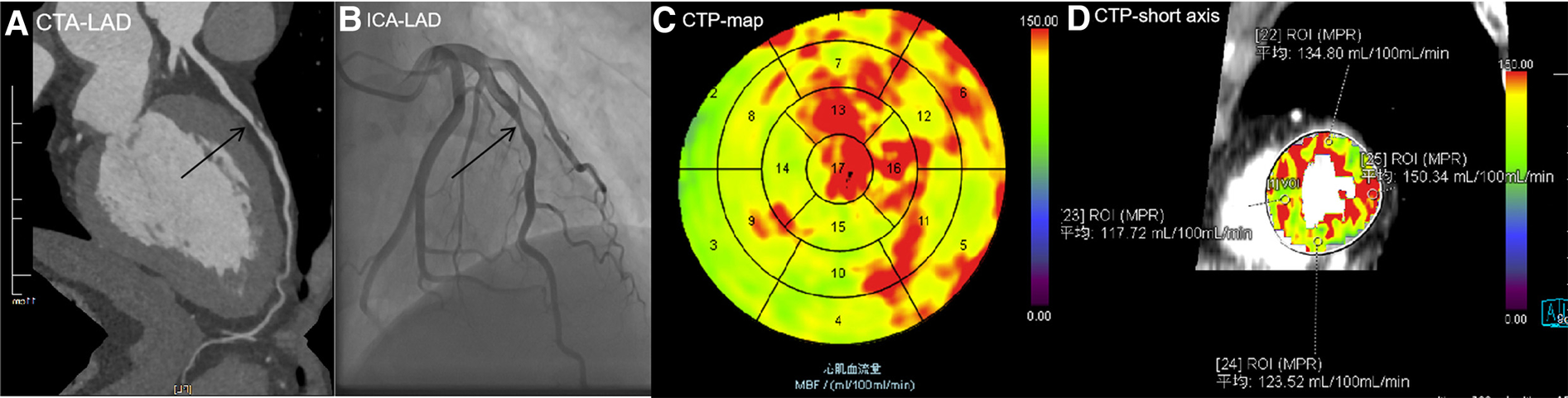 ATP, adenosine disodium triphosphate; AUC, area under the curve; CAD, coronary artery disease; CCTA, coronary computed tomography angiography; CT, computed tomography; CT-MPI, CT myocardial perfusion imaging; FFR, fractional flow reserve; ICA, invasive coronary angiography; MBF, myocardial blood flow; MBFa, absolute myocardial blood flow; MBF-ratio, relative myocardial blood flow ratio; MI, myocardial ischemia; ROC, receiver operating characteristic; CI, confidence interval.