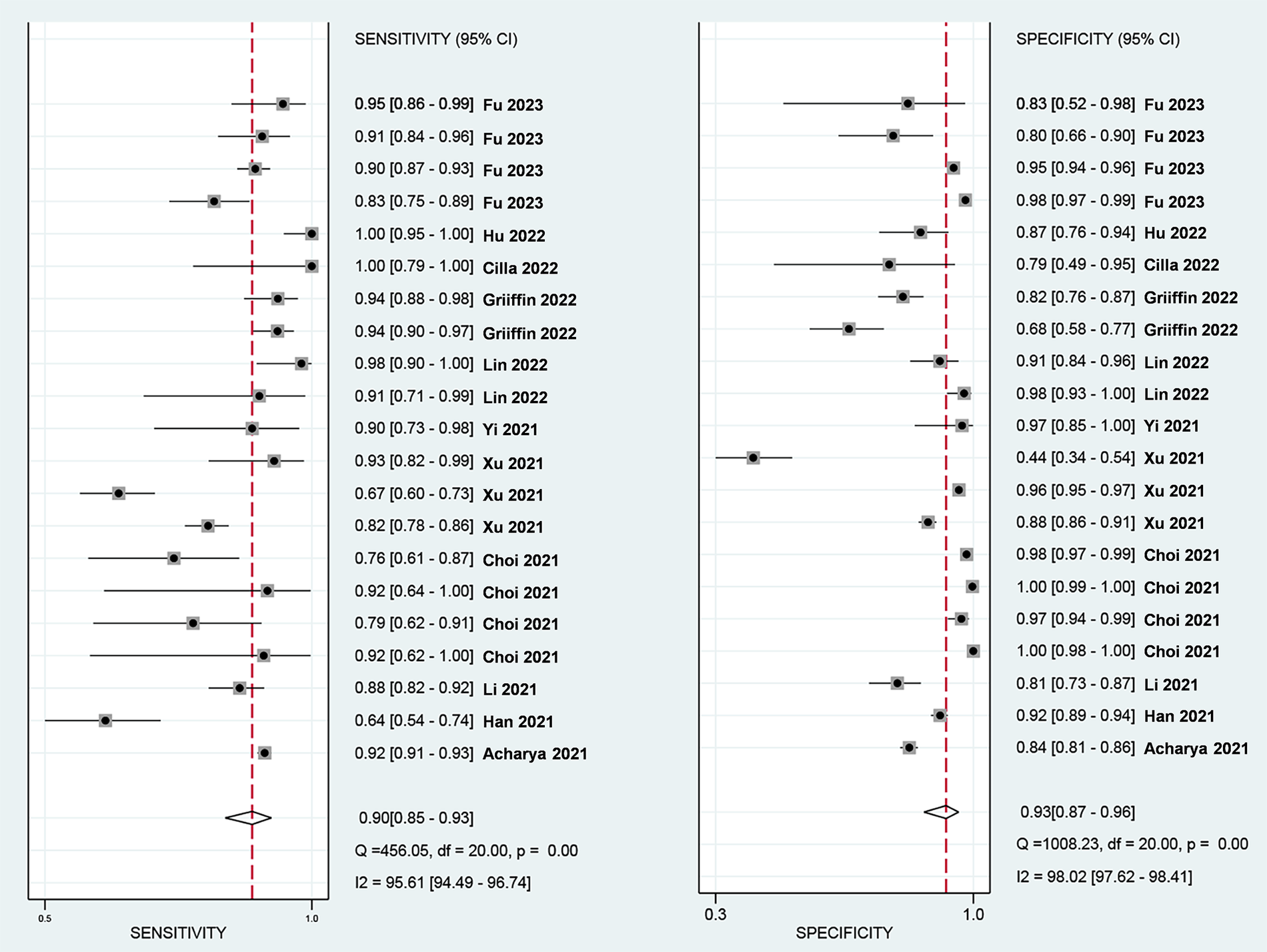 | Overall group | 21 | 1,484 | 0.90 (0.85–0.93) | 95.61 | 0.93 (0.87–0.96) | 98.02 | 116 (61–222) | 0.96 (0.94–0.97) |