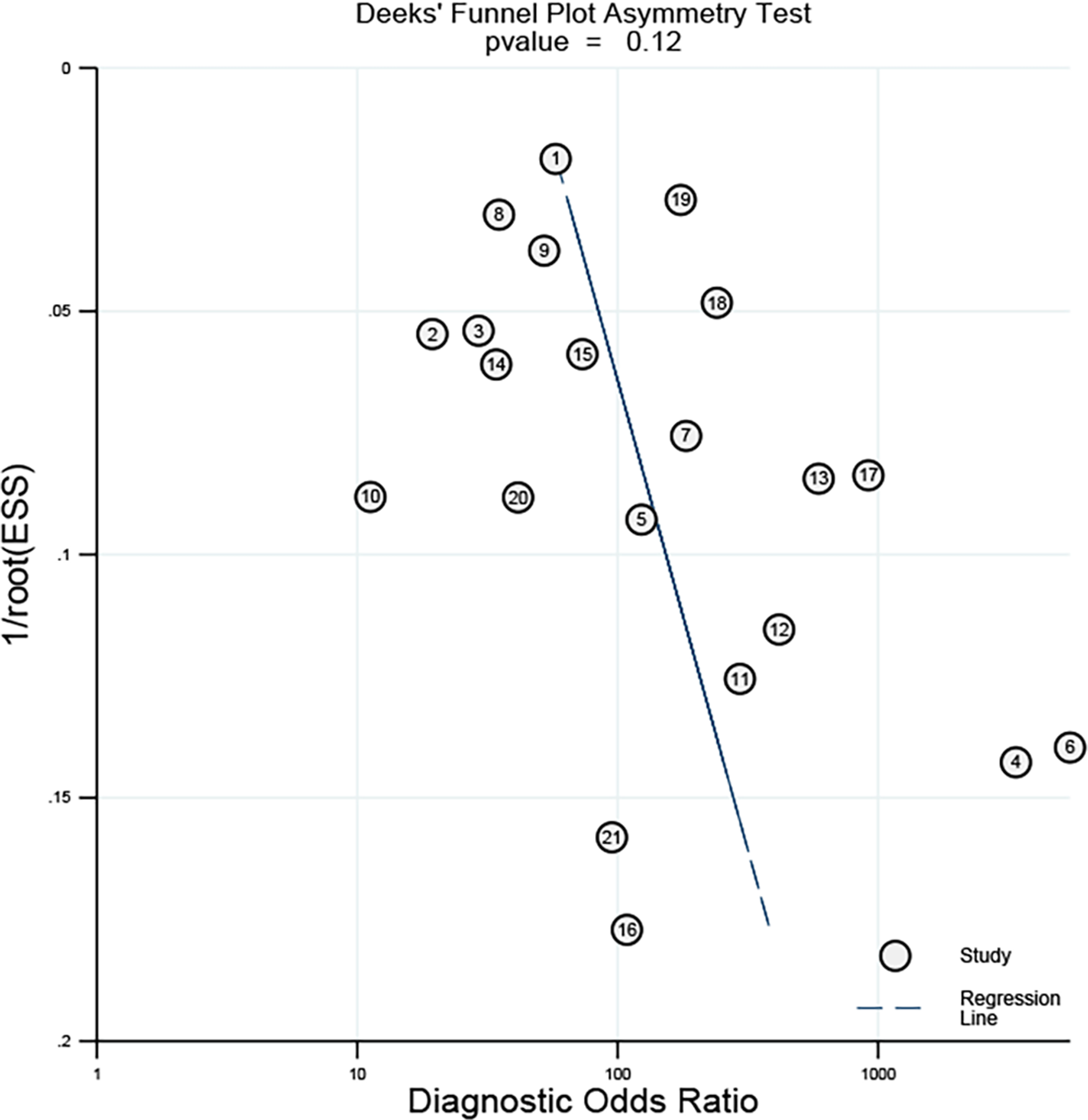 As shown in Figure 5, Deek's funnel plot showed a p-value of 0.12, suggesting no obvious publication bias was found in all eligible studies.