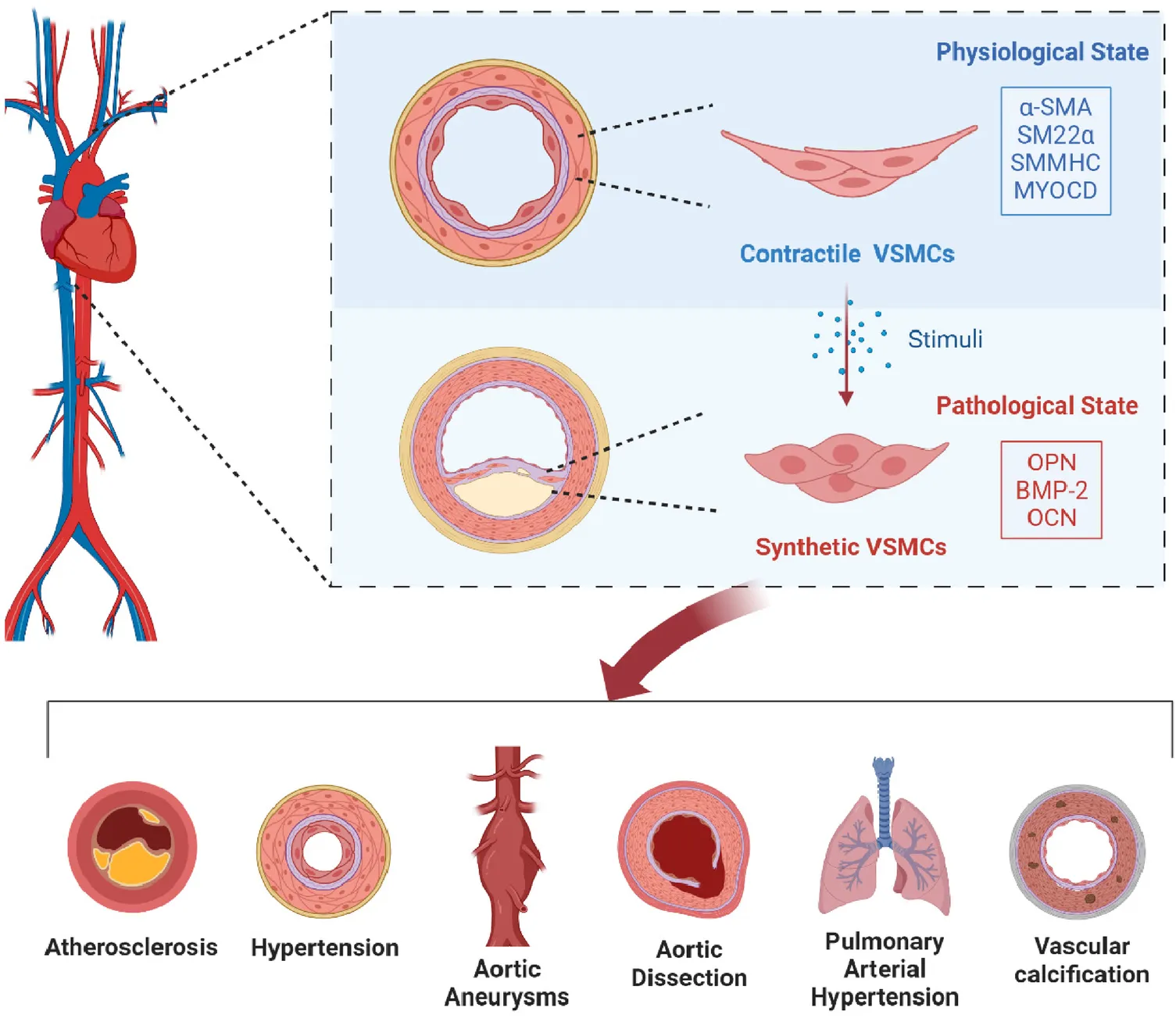 AS is a chronic inflammatory disease characterized by the formation of plaques within the arterial intima (17). Compared to VSMCs in healthy vessels, those in AS exhibit reduced expression of contractile molecules such as SM22 and α-SMA, while the expression of secretory markers like OPN and MMPs is increased (78). Genetic tracing studies have shown that about 70% of VSMCs in AS plaques originate from the phenotypic transformation, proliferation, and migration of medial VSMCs, thereby contributing to plaque formation (79).