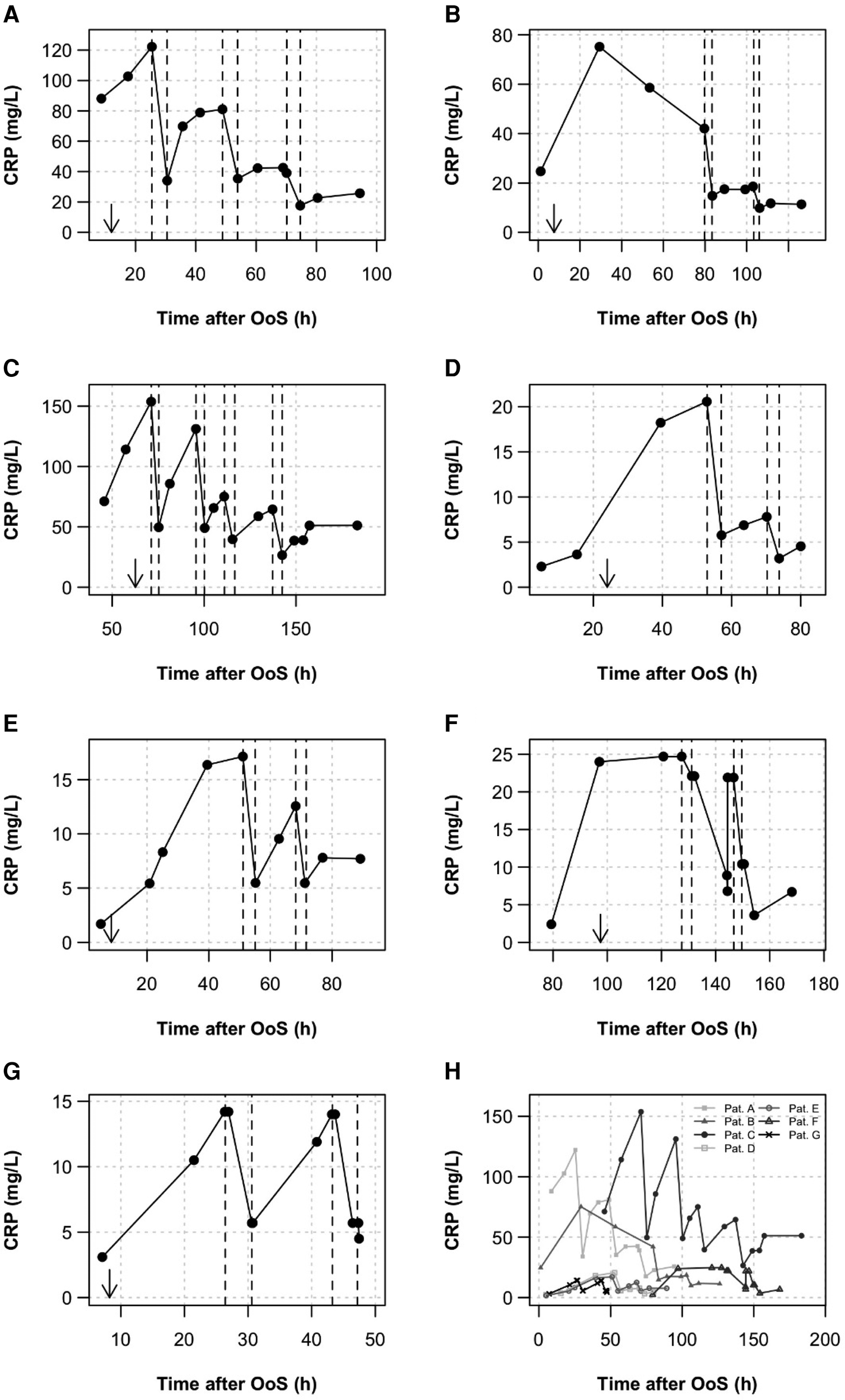 CRP kinetics. CRP was measured routinely during the clinical stay. (A–G) All kinetics are depicted. Apheresis treatments are shown as dashed lines. Arrows indicate the time of PCI. Patients received two to four CRP apheresis sessions after PCI and admission to the CPU. The first apheresis started at a mean of 62.1 ± 35.3 h after OoS, the second apheresis was approximately 16–20 h later. A third or fourth apheresis was performed if, another 12 h later, the CRP plasma concentration rose to values above 30 mg/L. (H) Summary diagram showing high variability of CRP levels in NSTE-ACS.