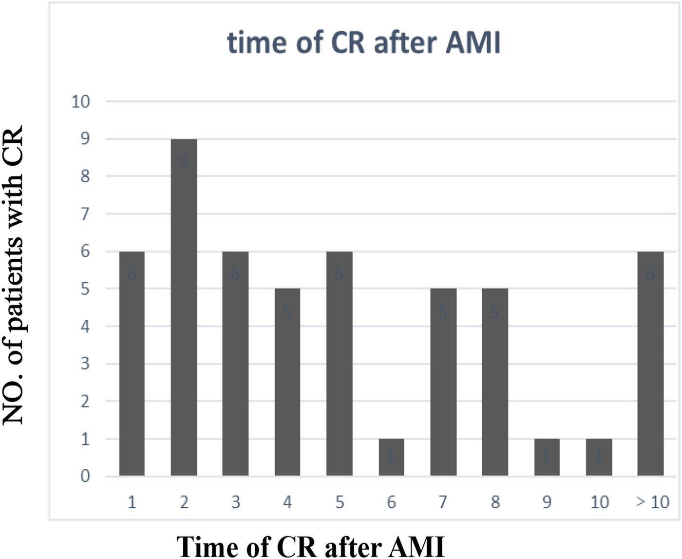| Time from AMI to CR (days) | 3.85 ± 2.71 | 7.10 ± 7.14 | 0.116 |