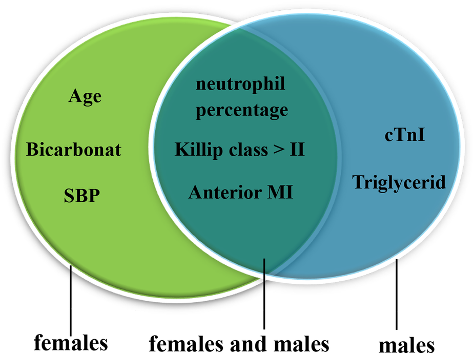The incidence of CR after AMI was 3.0% and in-hospital mortality was approximately 57%. Multivariate logistic regression analysis identified that white blood cell count, neutrophil percentage, anterior myocardial infarction, a Killip class of >II, and albumin level were independently associated with CR (p < 0.05). Stratifying analysis showed that age, systolic blood pressure, and bicarbonate were independent risk factors for female CR (p < 0.05) but not male CR. Triglyceride and cardiac troponin I were independent risk factors for male CR (p < 0.05) but not female CR. Anterior myocardial infarction, a Killip class of >II, and neutrophil percentage were independent risk factors for male and female CR (p < 0.05). Multivariate Cox regression analysis showed that the time from symptom to CR and the site of CR were independent predictors for in-hospital mortality from CR (p < 0.05). Stratification analysis indicated that risk factors did not differ based on gender, but platelet counts were predictors for in-hospital mortality in female and male CR.