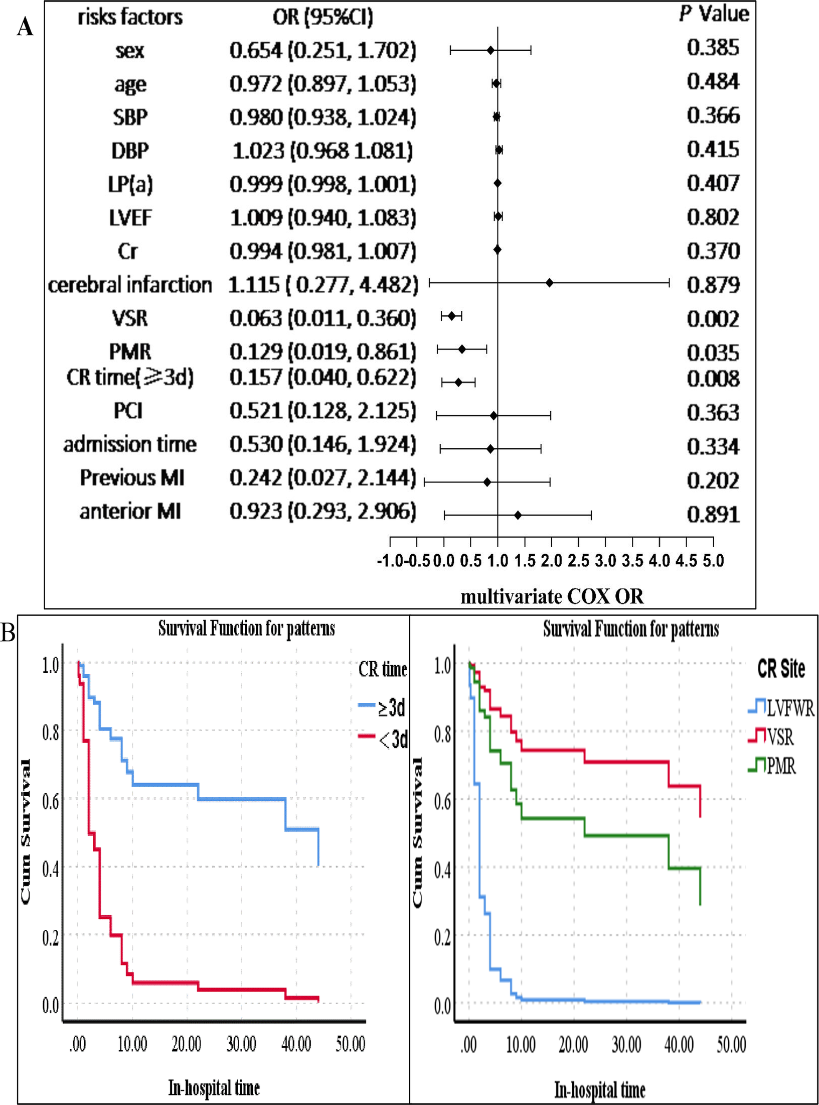 In this study, we enrolled 1,699 AMI cases from October 2013 to May 2020. A total of 51 cases were diagnosed with CR. Clinical diagnostic information was recorded and analyzed retrospectively. We randomly matched these cases with AMI patients without CR in a 1:4 ratio. Univariate and multivariate logistic regression and stratifying analysis were used to identify risk factors for CR. Univariate and multivariate Cox regression hazard analysis and stratifying analysis were used to assess predictors of in-hospital mortality from CR.