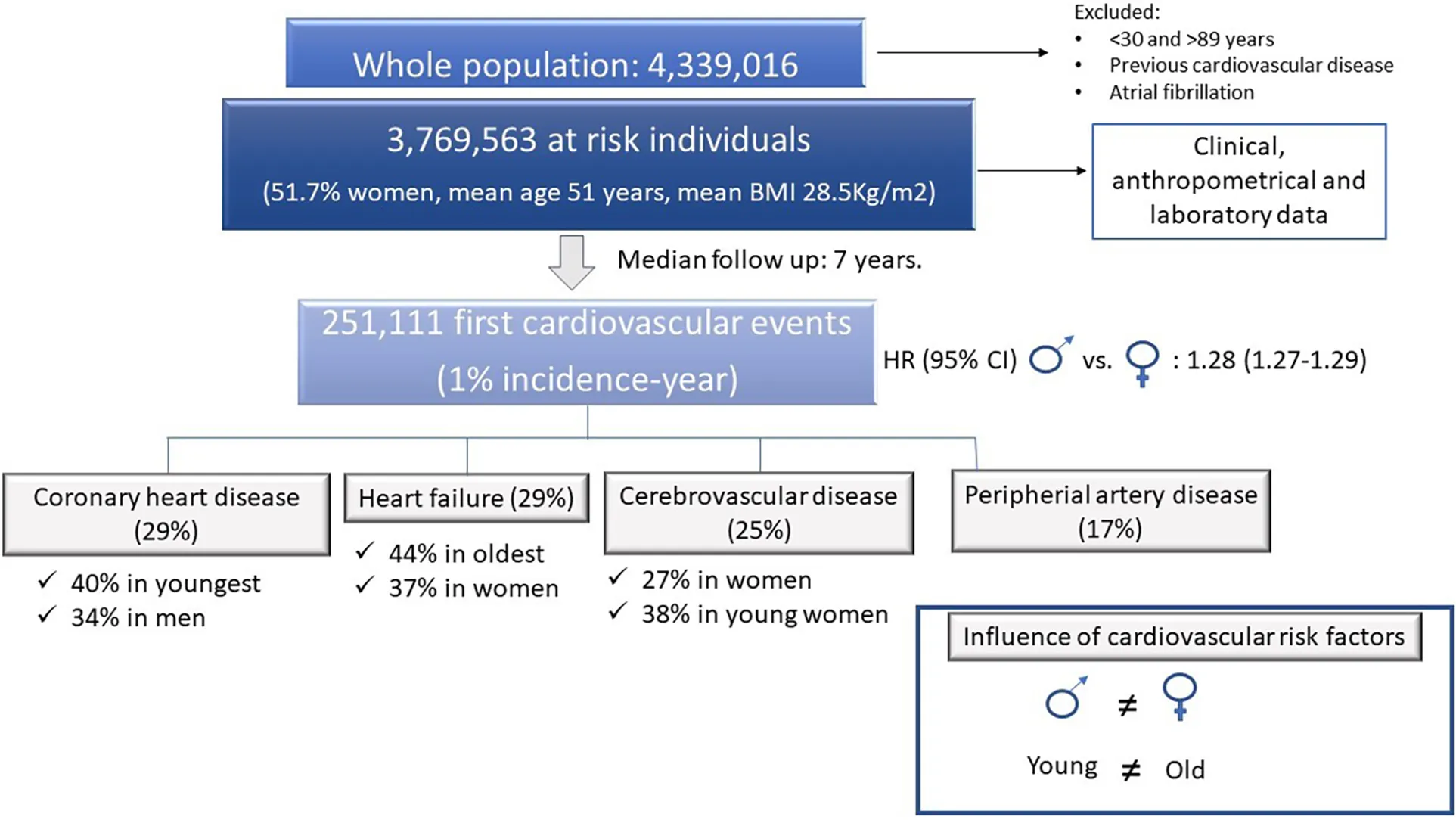Cardiovascular (CV) diseases are the most common cause of death worldwide. This study aimed to investigate the incidence and type of first CV event in a broad cohort of Spaniards, focusing on age and sex differences.