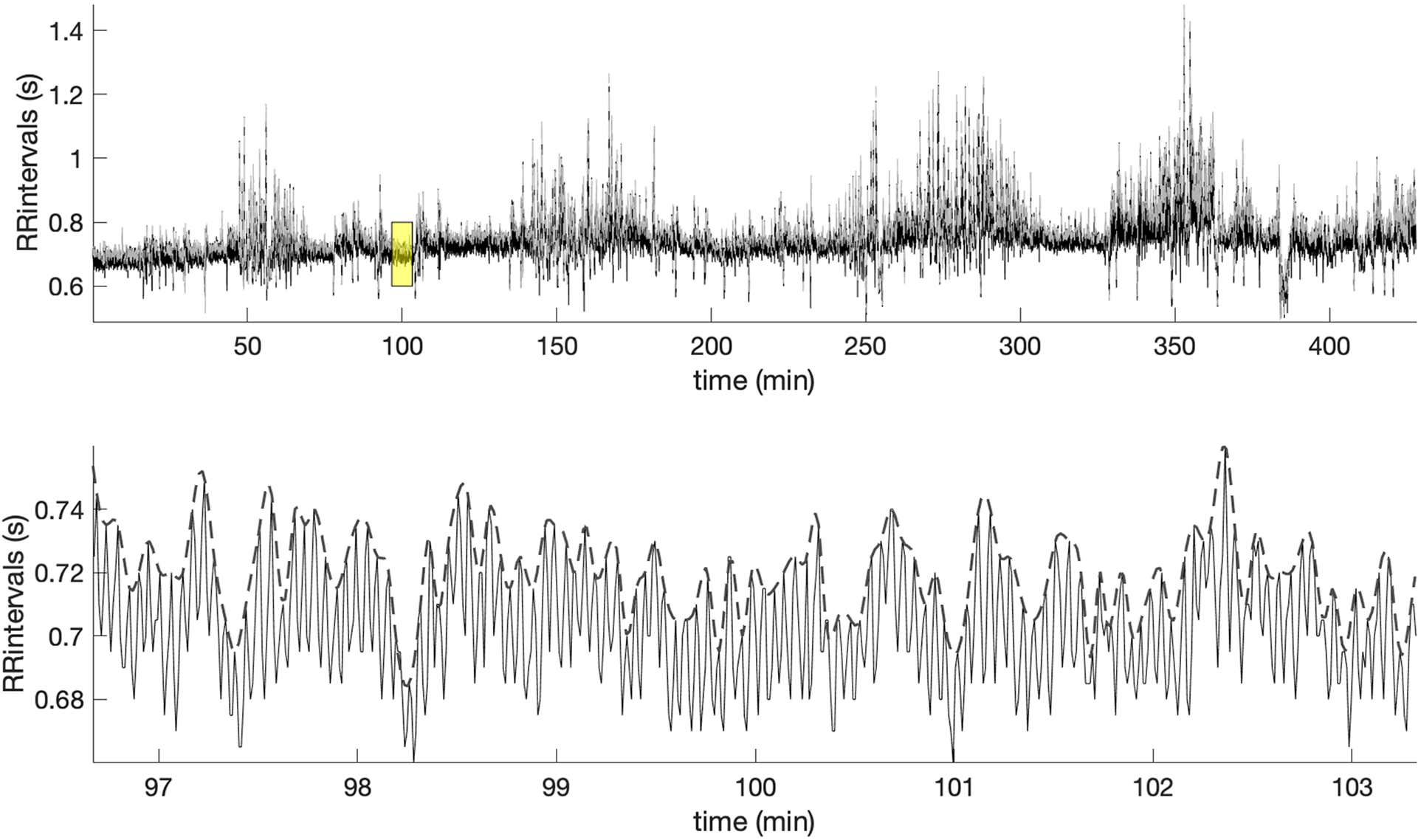 Example of the RR intervals during sleep and along with the superimposed MM fluctuations (gray line). The lower panel offers a zoomed-in view of the highlighted yellow window, showing the MM fluctuations (dashed line).