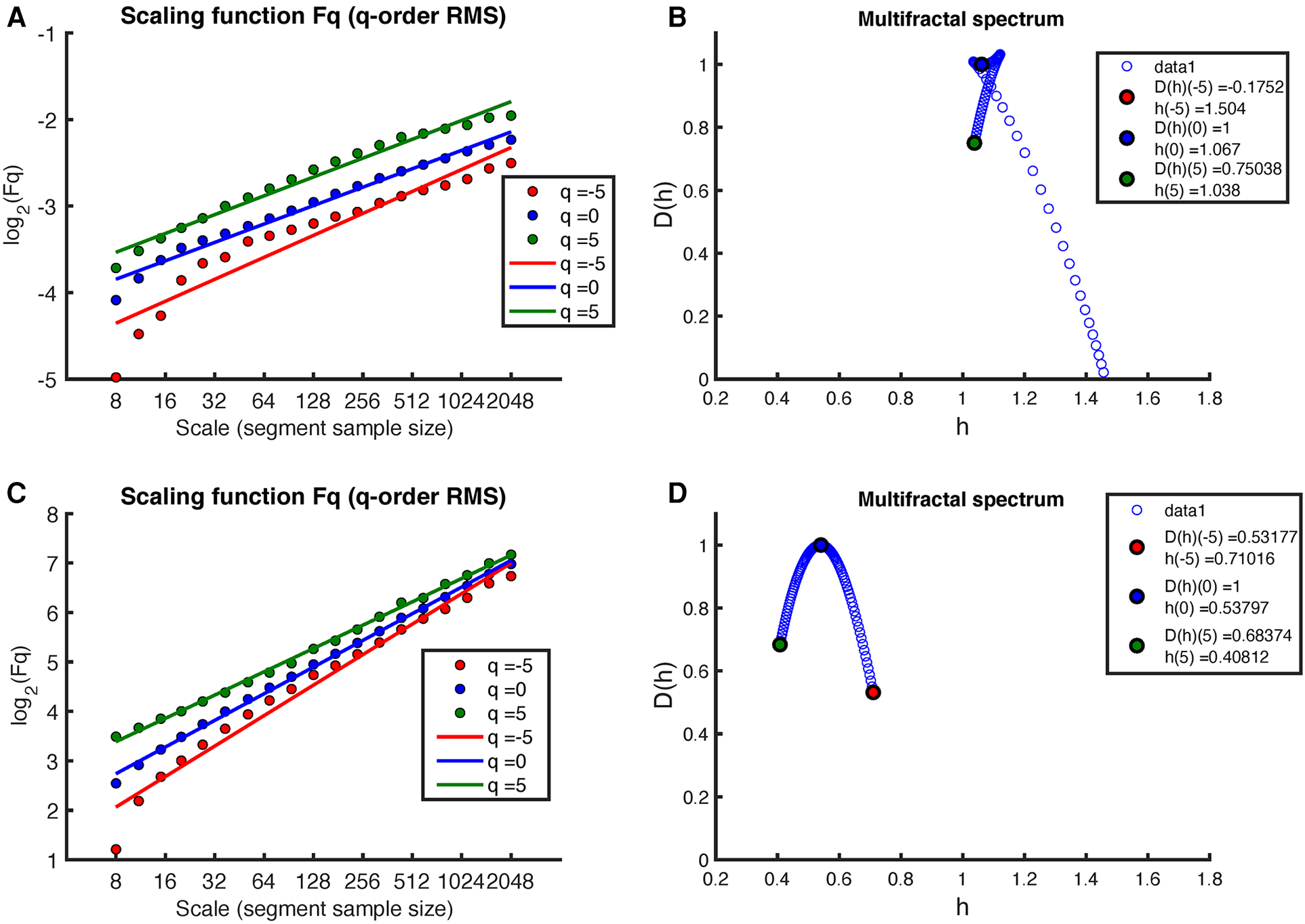 The RR intervals exhibit fluctuation around a mean value, representing the mean Heart Rate. For extended time periods like sleep, these RR intervals tend to form a Gaussian distribution. However, for shorter time spans, variations in the properties of the global Gaussian distribution can be observed. These variations might correlate with sleep stages or sequences of pathological events. Therefore, an appropriate method is needed to account for these local variations over time. Multifractal Detrended Fluctuation Analysis (MF-DFA) is particularly well-suited for this purpose because it extends beyond the limitations of the standard DFA by considering the scaling of -order moments at different time scales (37, 38). Unlike standard DFA, which specifically focuses on the second moment (), MF-DFA considers different -order moments, providing a more comprehensive perspective on the multifractal nature of the data. The latter approach allows for identifying or detecting intricate correlations and patterns that may remain unnoticed using other methods (27).