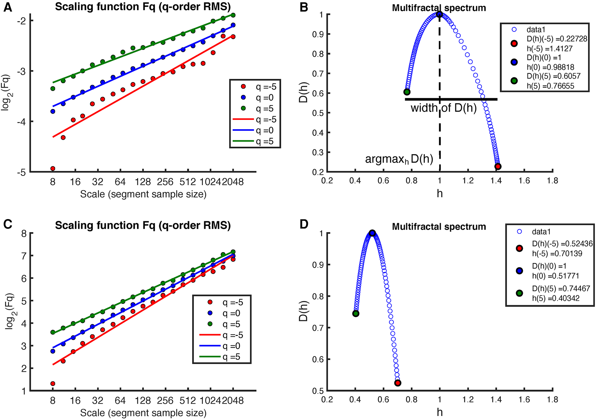 The multifractal spectrum was derived from the MM fluctuations of the RR intervals. This was done using the Multifractal Detrended Fluctuation Analysis (MF-DFA) method with linear detrending. The analysis included a spectrum of scales ranging from 16 to 2,048 and involved the evaluation of different -orders, specifically . From the multifractal spectrum, we extracted the multifractal indices, including the position and the width of shown in Figure 4.