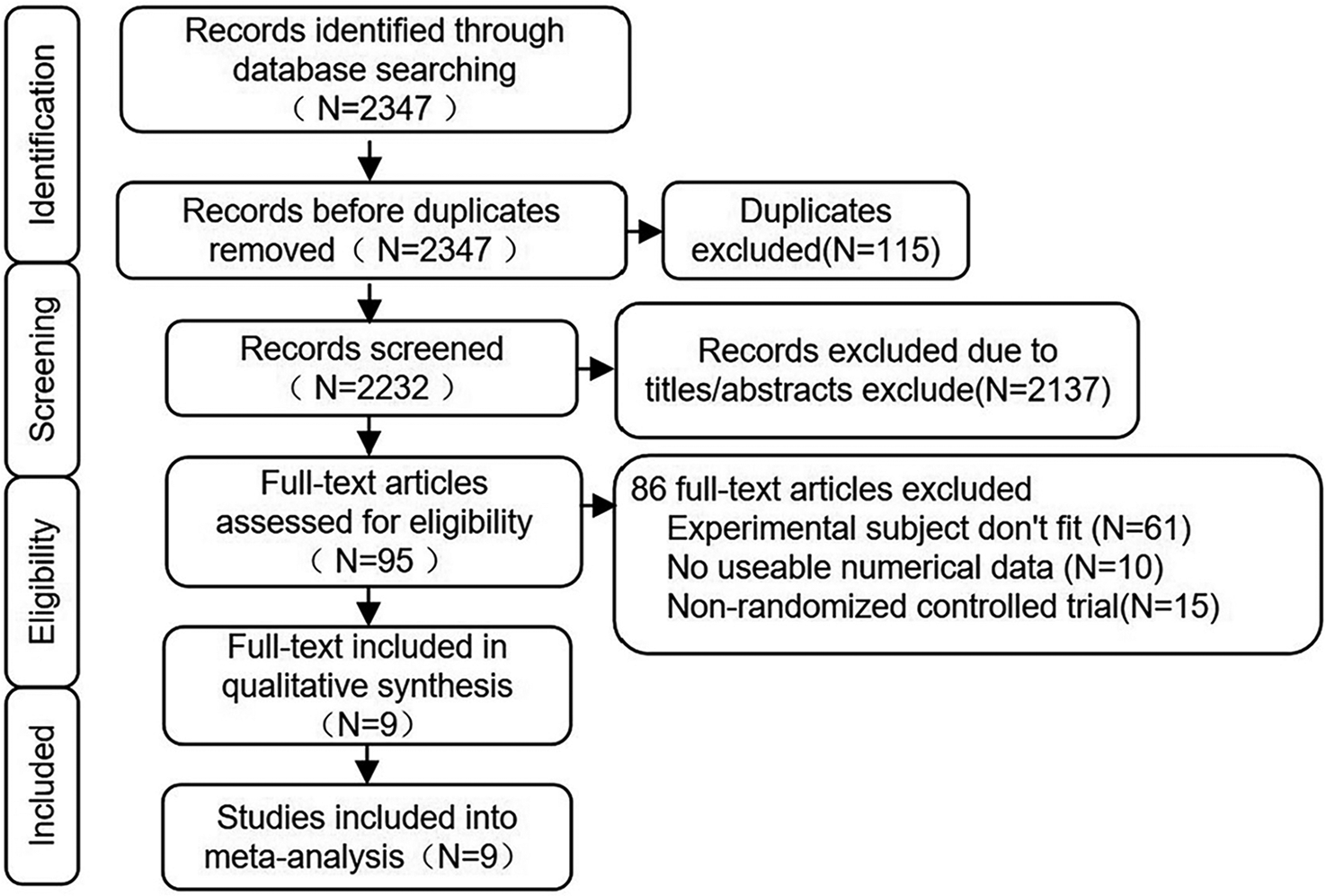 The literature screening process followed the PRISMA flowchart, and the retrieval process is illustrated in Figure 1. A total of 2,347 articles were retrieved from PubMed, Web of Science, Cochrane Library, Embase, Scopus, CNKI (China National Knowledge Internet), and Wanfang Database. Among these, 115 articles were duplicates. Based on the titles and abstracts, 2,137 articles were clearly identified as not meeting the requirements. After thoroughly reviewing the remaining 95 articles, 61 were found to be irrelevant to the theme of this study, 10 did not provide clear outcome measures for systolic or diastolic blood pressure, and 15 were not randomized controlled trials. Therefore, only 9 articles met the criteria for this study.