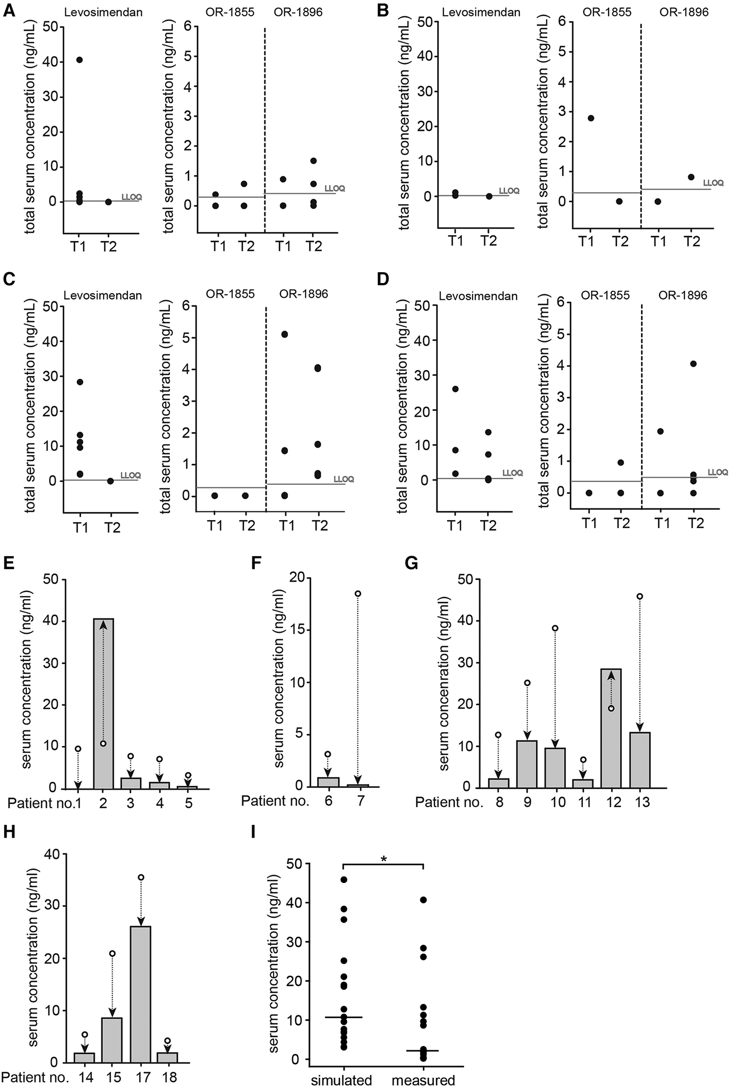 TSC of levosimendan and metabolites in cardiac surgery patients with CPB and comparison of simulated and measured serum levels of levosimendan for each patient at T1. Total serum concentrations (TSC, ng/ml) were measured in samples from cardiac surgery patients with CPB receiving levosimendan after induction of anaesthesia at dosages of (A) 1.25 mg of levosimendan (levosimendan n = 5; OR-1896 n = 4 and OR-1855 n = 4); (B) 1.25 mg of levosimendan as well as a second dose of 1.25 mg 3–4 h after surgery (n = 2); (C) 2.5 mg of levosimendan (n = 6); (D) 2.5 mg of levosimendan as well as a second dose of 2.5 mg 5–21 h after surgery (n = 4). T1: Shortly after cardiac surgery; T2: First day after cardiac surgery; grey horizontal line: lower limit of quantification (LLOQ; levosimendan 0.126 ng/ml; OR-1855 0.305 ng/ml; OR-1896 0.368 ng/ml) (21). (E) Comparison of measured levosimendan TSC (grey bars) and estimated TSC (white circles) at T1 in patients receiving 1.25 mg of levosimendan (n = 5); (F) Comparison of measured levosimendan TSC (grey bars) and estimated TSC (white circles) at T1 in patients receiving 1.25 mg of levosimendan as well as a second dose of 1.25 mg 3–4 h after surgery (n = 2); (G) Comparison of measured levosimendan TSC (grey bars) and estimated TSC (white circles) at T1 in patients receiving 2.5 mg of levosimendan (n = 6); (H) Comparison of measured levosimendan TSC (grey bars) and estimated TSC (white circles) at T1 in patients receiving 2.5 mg of levosimendan as well as a second dose of 2.5 mg 5–21 h after surgery (n = 4). Serum concentrations (ng/ml) were calculated using individual patient data. The simulation for patient 16 could not be performed due to insufficient serum volume for quantification at T1. Arrows show difference between simulated and measured serum concentrations. (I) Comparison of simulated levosimendan TSC with measured TSC within the total patient population at T1 (n = 17; *p < 0.05 Wilcoxon signed rank test). Data are expressed as dot plots with the respective median (black line).