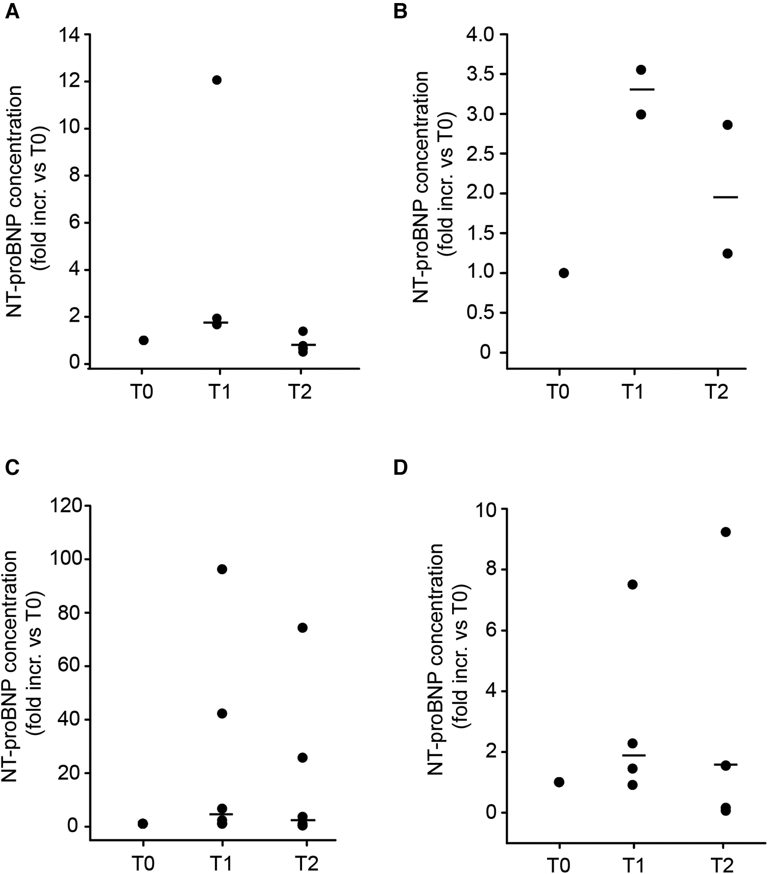 NT-proBNP concentrations of cardiac surgery patients with CPB. NT-proBNP was measured in the same samples from patients receiving levosimendan after induction of anaesthesia at dosages of (A) 1.25 mg of levosimendan (n = 5); (B) 1.25 mg levosimendan and a second dose (1.25 mg) 3–4 h after surgery (n = 2); (C) 2.5 mg levosimendan (n = 6); (D) 2.5 mg levosimendan and a second dose (2.50 mg) 5–21 h after surgery (n = 5). T0: before cardiac surgery; T1: shortly after cardiac surgery; T2: First day after cardiac surgery. Data are expressed as dot plots with the respective median (black line). No significant difference between the different time points within each treatment group was found (one-way ANOVA).