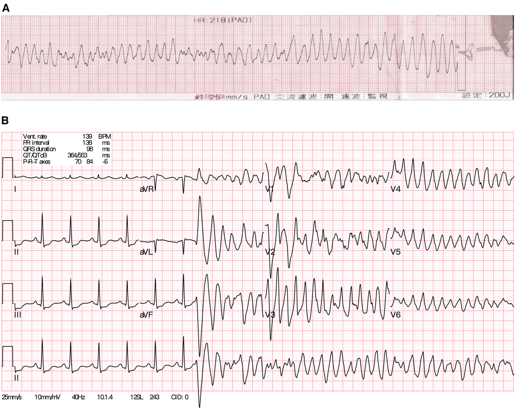 (A) The electrocardiogram of the young female patient showing ventricular fibrillation during resuscitation initially. (B) After achieving recovery of spontaneous circulation, the sinus rhythm soon degenerated into polymorphic ventricular tachycardia again.