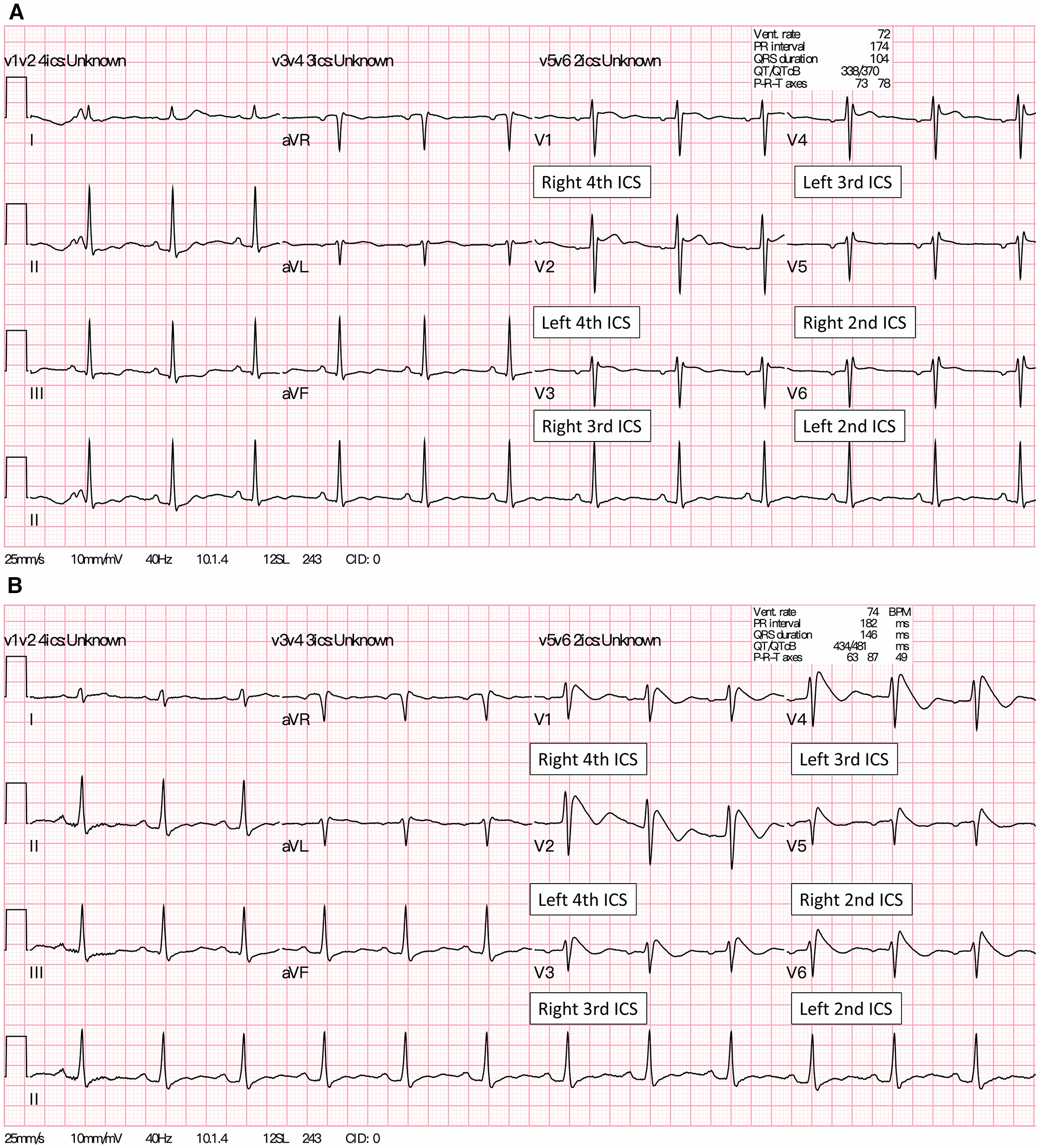 (A) A baseline 12-lead ECG of the patient showed a Brugada type 2 pattern (saddleback ST-segment elevation) in the precordial leads V1 placed at 4th ICS and lead V2 placed at 4th ICS. (B) About four minutes after the IV ajmaline injection, a Brugada type 1 pattern (coved-type ST-segment elevation) appeared in all precordial and high intercostal leads (V3-V6). Of note, lead V3 at the right 3rd ICS and lead V4 were placed at the left 3rd ICS, whereas lead V5 at right 2nd ICS and lead V6 were placed at the left 2nd ICS, respectively. ICS, intercostal space.