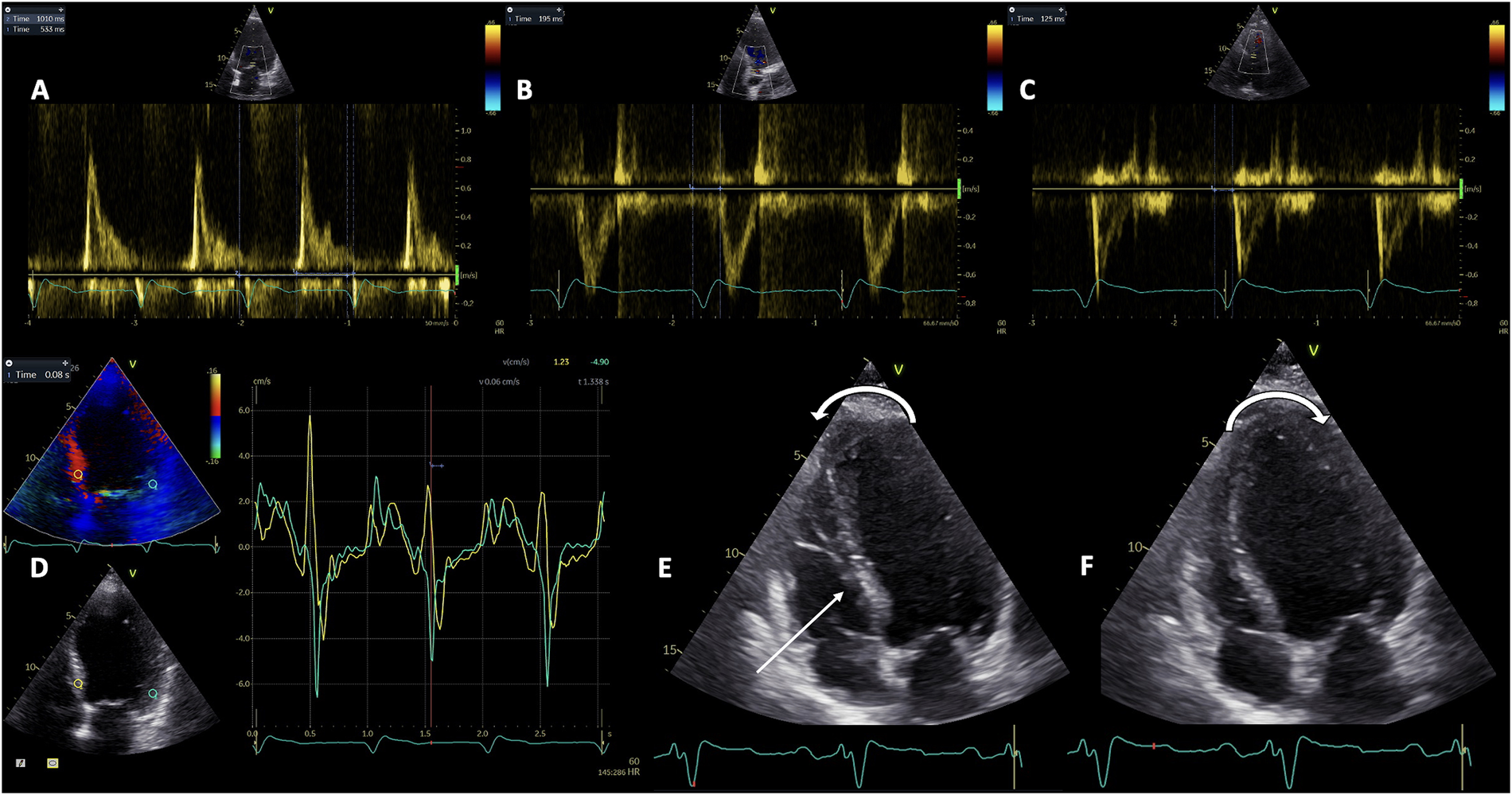 The evaluation of the three types of mechanical dyssynchrony by Doppler echocardiography. Pulsed-wave Doppler assessment of atrioventricular dyssynchrony as the diastolic filling time relative to cardiac cycle duration (A); and interventricular dyssynchrony as the difference between LV pre-ejection time (B), and RV pre-ejection time (C) Tissue Doppler Imaging evaluation of intraventricular dyssynchrony as the basal septal to lateral wall delay (D) Representation of septal flash and apical rocking (E and F). LV, left ventricle; RV, right ventricle.
