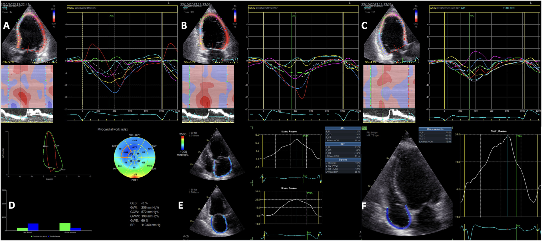 Two-dimensional speckle-tracking analysis of segmental left ventricular myocardial deformation showing the intraventricular dyssynchrony in the apical 4-chamber (A), 2-chamber (B) and 3-chamber (C) views. Myocardial work analysis showing increased GWW, and regional WW at the level of the septum, and low GWI, GCW and GWE (D) Left atrial strain analysis (E) and Right atrial strain analysis (F) showing reduced values in a patient with left ventricular dyssynchrony and left bundle branch block. GCW, global constructive work; GWE, global work efficiency; GWI, global work index.