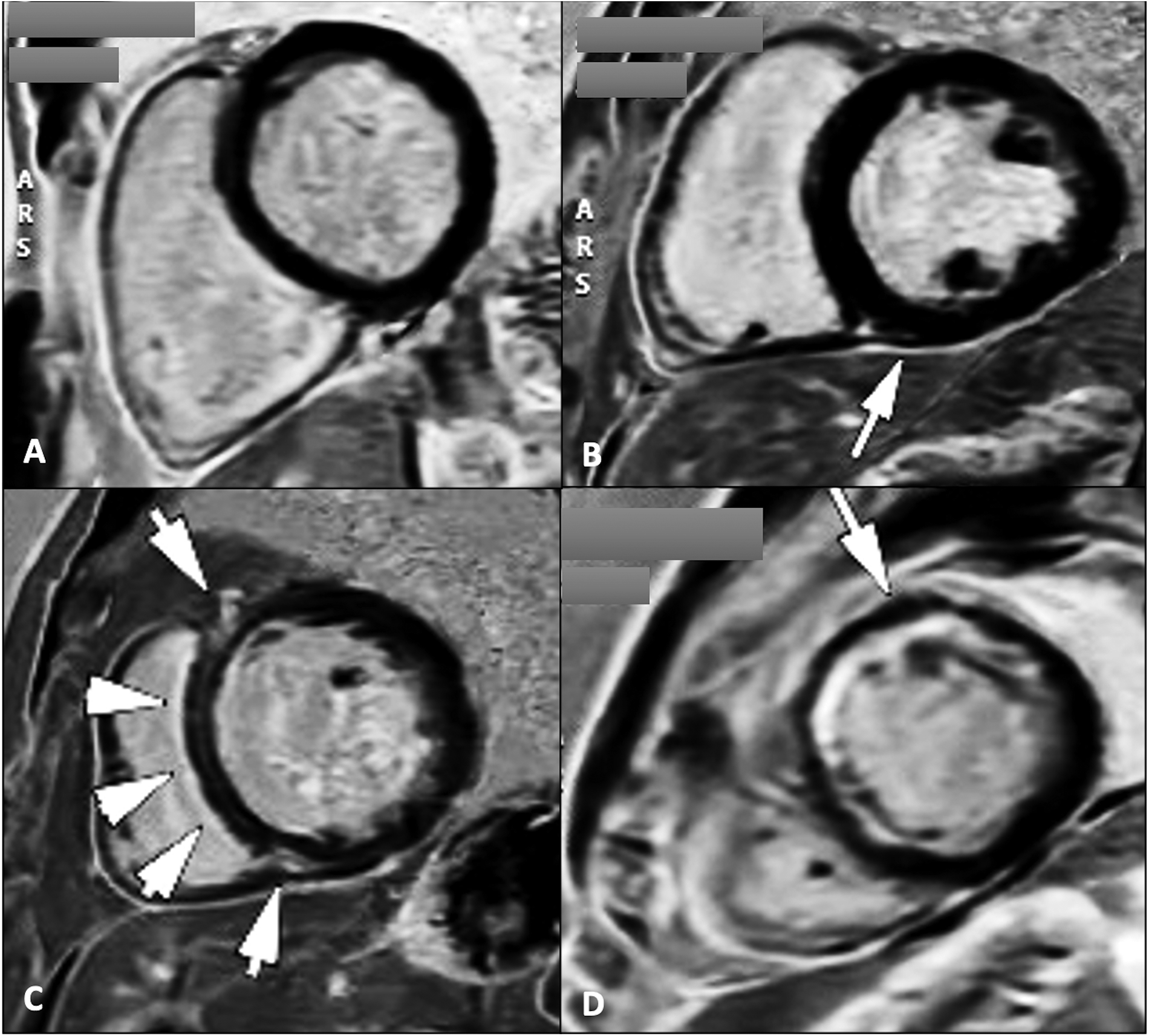 Cardiac magnetic resonance late gadolinium enhancement sequences for the assessment of myocardial scar tissue/fibrosis in four patients with dilated cardiomyopathy showing absence of LGE (A); localized LGE at the level of the inferior intraventricular septum on the RV insertion point (B); midwall linear fibrosis at the level of the intraventricular septum commonly known as “septal stripe” LGE, and at the level of the RV insertion points (C); and subendocardial antero-septal and anterior wall LGE (D) types B and C LGE pattern are typically found in patients with genetic/idiopathic etiologies of dilated cardiomyopathies, while pattern D suggests an ischaemic etiology. LGE, late gadolinium enhancement; RV, right ventricle.