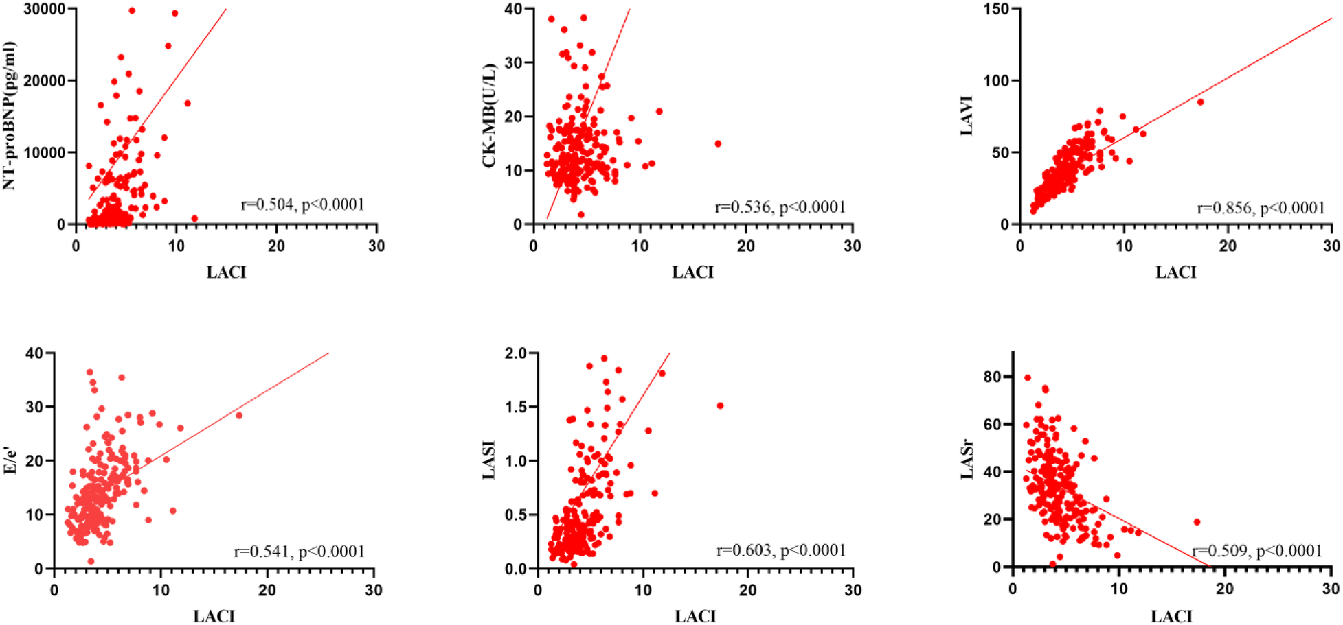 Figure 1 demonstrated that LACI was moderately correlated with NT-proBNP, CK-MB, E/e’, LASI, and LASr (r = 0.504, r = 0.536, r = 0.541, r = 0.603, r = −0.509, P < 0.0001) and highly correlated with LAVI (r = 0.856, P < 0.0001).