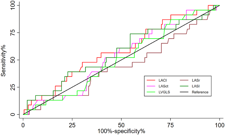 Figure 2 showed the prognostic performance of LACI, LASr, LASct, LASI, and LVGLS for predicting heart failure during follow-up. The AUC of LACI for the entire study population was comparable to that of LVGLS (0.588 vs. 509, P = 0.464), LASr (0.588 vs. 0.448, P = 0.132), LASct (0.588 vs. 566, P = 0.971) and LASI (0.588 vs. 0.570, P = 0.874). A LACI of 5.0 was the best cut-off value to identify heart failure.