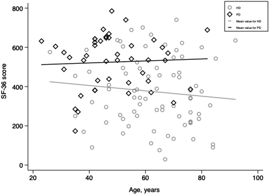 Scatter plots of SF-36 scores for patients receiving hemodialysis and peritoneal dialysis. HD, hemodialysis; PD, peritoneal dialysis.