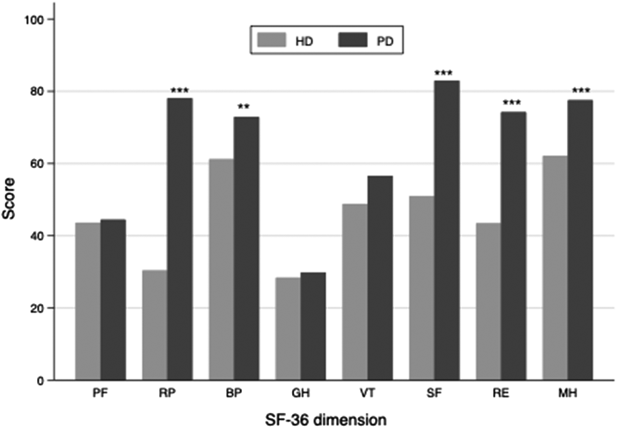 Bar chart of the SF-36 subscale score in hemodialysis and peritoneal dialysis subgroup. The PF, SF, RE and MH subscale scores were significantly higher in peritoneal dialysis than in the hemodialysis subgroup. PF, physical functioning; RP, role-physical functioning; BP, bodily pain; GH, general health; VT, vitality; SF, social functioning; RE, role-emotional functioning; MH, mental health; HD, hemodialysis; PD, peritoneal dialysis. *** indicates a p value <0.001, ** indicates a p value < 0.05.