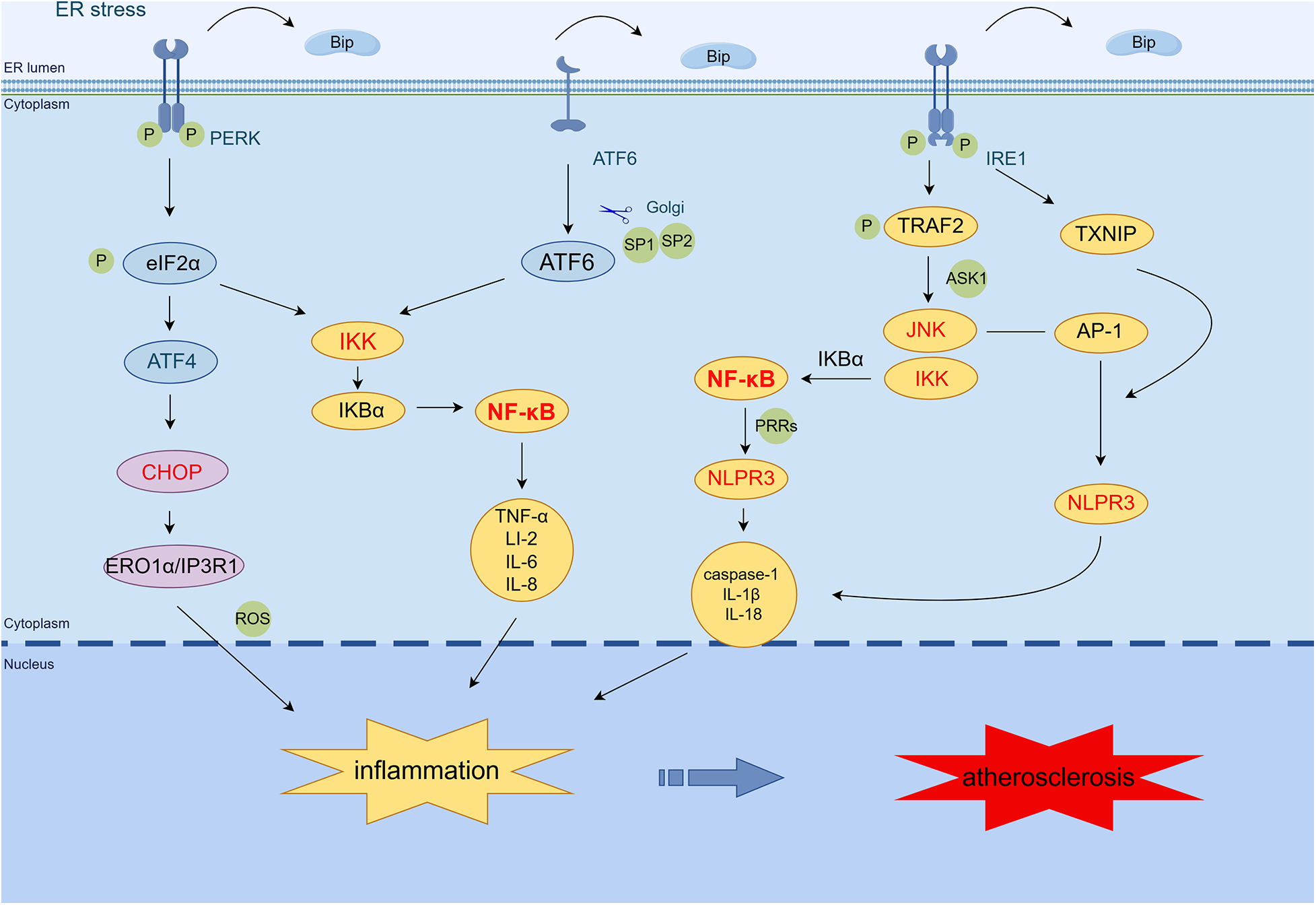 ER stress mediates the inflammatory response in AS. PERK induces NF-κB activation primarily through translational attenuation of free IκBα mediated by phosphorylation of eIF2α. The IRE1α·TRAF2·IKK complex induces IκBα degradation, NF-κB activation, and NLRP3 inflammasome activation. In addition, activated JNK promotes the formation of NLRP3 inflammasome by phosphorylating the transcription factor AP-1 and induces the expression of caspase-1, IL-1β, IL-18, and other inflammatory genes. IRE1α increases the expression of TXNIP protein, which activates the NLRP3 inflammasome, leading to caspase-1 dissociation and IL-1β secretion. The ATF6 branch activates the expression of NF-κB and inflammatory genes such as TNF-α, IL-2, IL-6, and IL-8 through the transient phosphorylation of Akt. PERK/ATF4/CHOP transcription activates ERO1α, increases ROS production, and induces inflammation. (By Figdraw.) TRAF2, tumor necrosis factor (TNF) receptor-associated factor-2; JNK, c-Jun N-terminal kinase; ASK1, apoptotic signaling kinase-1; IKK, IκB kinase; IκB, inhibitor of NF-κB; NF-κB, nuclear factor-κB; AP-1, activator protein-1; NLRP3, NOD-, LRR-, and pyrin domain-containing protein 3; CHOP, C/EBP-homologous protein; ERO1α, endoplasmic reticulum oxidoreductase 1 alpha; IP3R1, inositol 1,4,5-trisphosphate receptor type 1; PRRs, pattern recognition receptors; TXNIP, thioredoxin-interacting protein; ROS, reactive oxygen species.